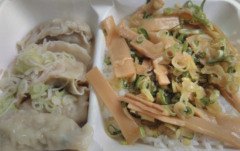 井土ヶ谷駅そばの豚骨ラーメン店です。テイクアウトは炙りチャーシュー丼、ネギメンマ丼、ネギ丼に焼餃子、水餃子、麻辣餃子。丼と餃子を組み合わせられます。写真はネギメンマ丼+水餃子(650円)。メンマとネギのバランスの良さで箸が進みます。