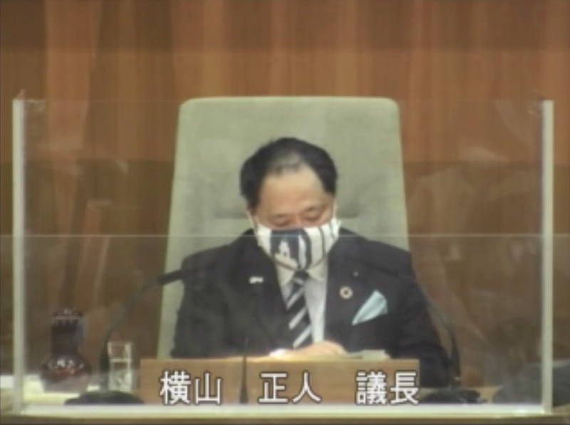 国民1人あたり10万円が支給される特別定額給付金について、12日からマイナンバーカード所有者を対象にしたオンライン申請が始まりました。郵送での申請書の発送は5月下旬の予定です。本会議の中で林文子市長は「18日に給付金コールセンターを開設する」と電話相談窓口を設ける考えを明らかにしました。臨時会は15日までの予定です。(写真はマスクを着用して議事を進行する横山正人議長、市会インターネット中継から)