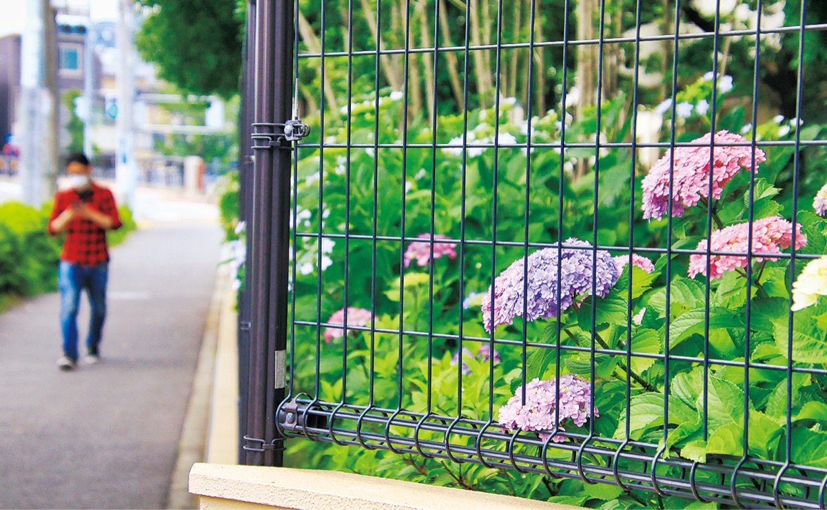 東蒔田公園=東蒔田町=は常に季節の花がきれいに咲く場所。公園の外側に花がズラっと並び、外出自粛中は桜などを見られなかった近隣住民の目を楽しませている。