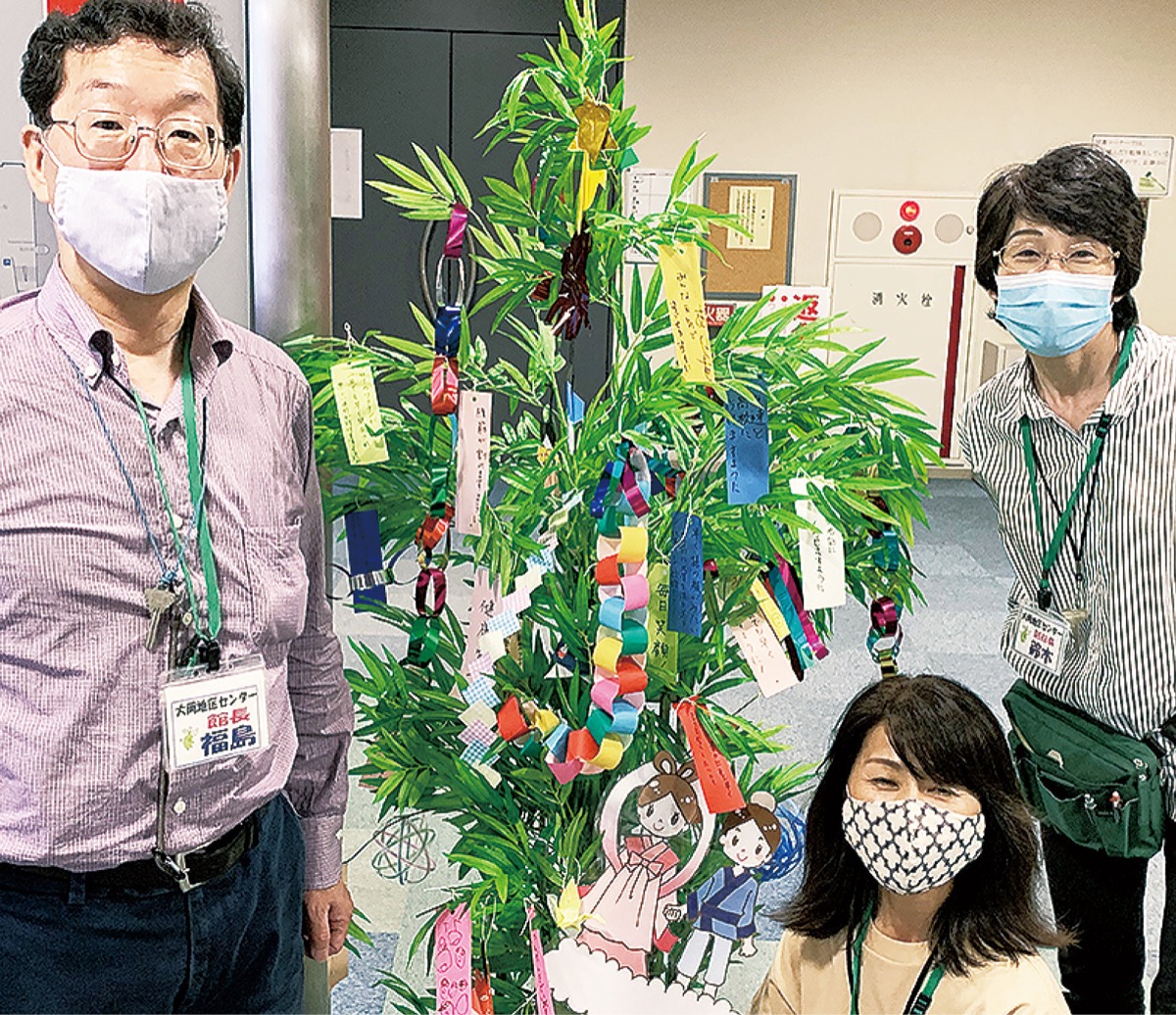 同館は「消毒や換気を徹底し、できることからコツコツと地域を盛り上げていきたい」としている。7月7日まで受付正面に七夕飾りが展示され、コロナ収束を願う言葉など、多くのメッセージが寄せられている。