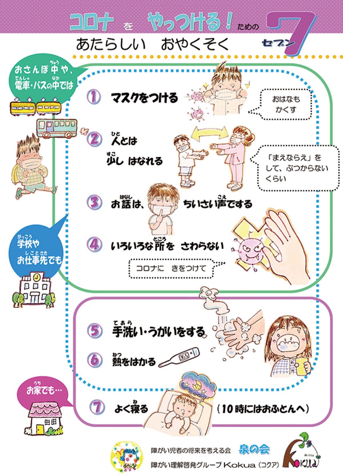 店舗や施設など、街中には感染予防に関するさまざまな注意書きがあふれているが、知的障害者にとって、「文字が多過ぎて、理解が難しい」という。さらに、「そこには書かれてない『暗黙の了解』のようなことも増えている」と伊藤さんはいう。そこで、外出時や家庭内で気を付けるべき点を7つにまとめ、「コロナをやっつけるためのあたらしい おやくそく7」というポスターを作った。▽マスクの着用▽人と離れて小さな声で話す▽いろいろな所を触らない--といった注意点を分かりやすいイラストと一緒に紹介。多くの人に知ってもらおうと、南区障がい児者団体連絡会を通して地域作業所などにも配布した。紙芝居の制作も検討している。