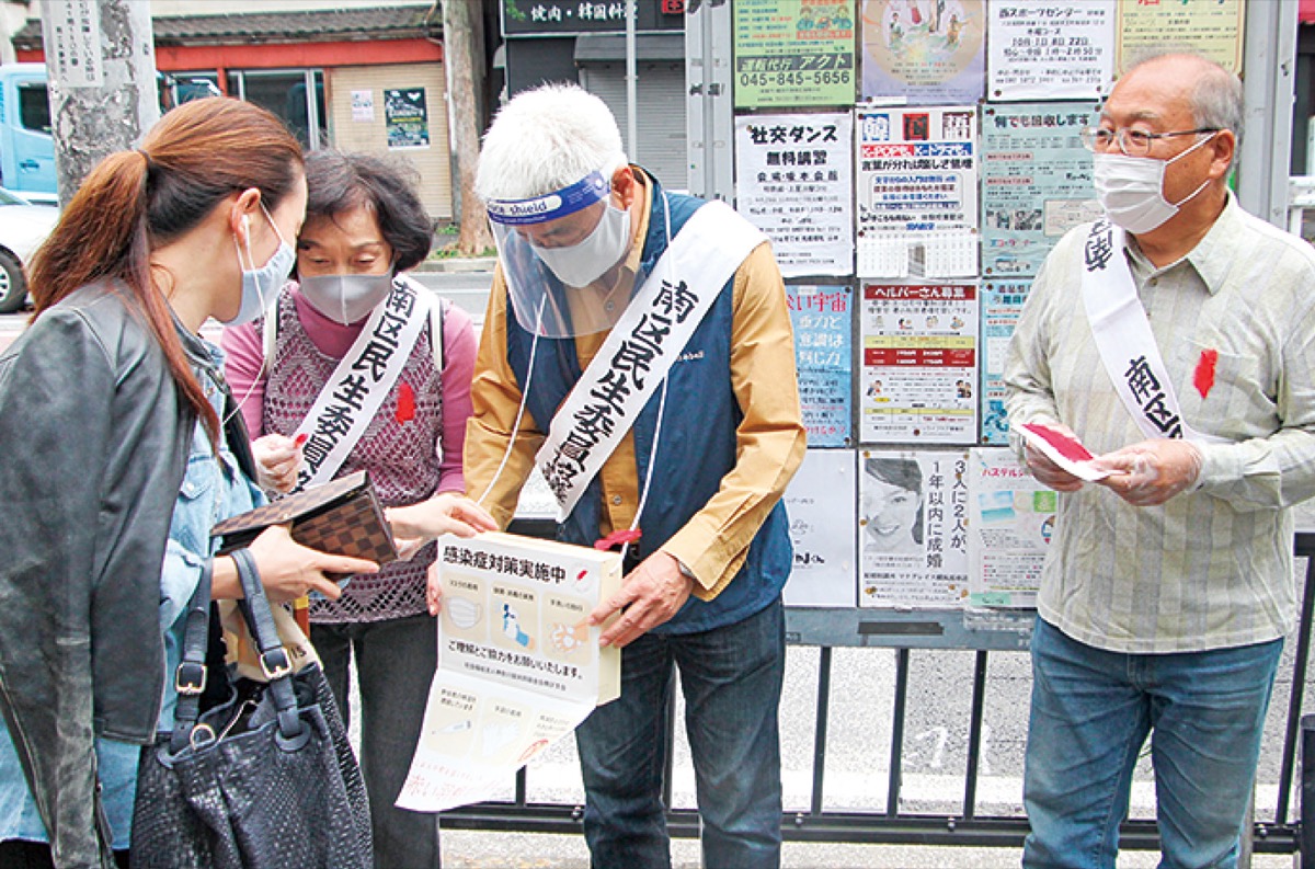 1日午後、地下鉄蒔田駅の出口には南区民生委員児童委員協議会の栗田一伸会長ら蒔田地区の民生委員が立っていた。これまでなら「赤い羽根共同募金にご協力をお願いします」と声を出して通行人に呼び掛けていたが、今回は共同募金の目的や使い道を記した紙を胸のあたりに掲げるだけにとどめた。