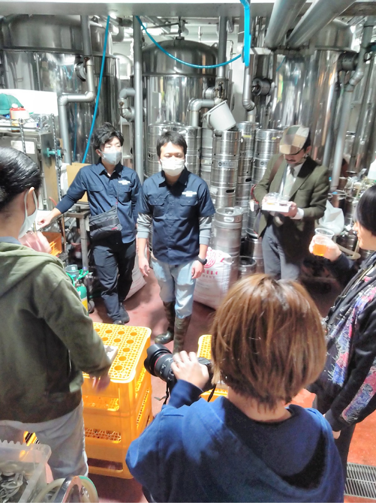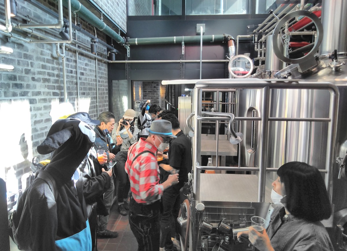 実験初日となった10月31日は、まず「横浜ビール」でビール造りの話を聞き、同所のクラフトビールを味わった後、ビアバイクに乗車。「アパホテル&リゾート」内にある「REVO BREWING(レボ・ブルーイング)」を目指してビアバイクを漕いだ。そこでも話を聞きながら3種類のクラフトビールを味わい、最後は「横浜ハンマーヘッド」にある「QUAYS pacific grill」の「NUMBER NINE BREWERY」へ進み、醸造現場の話を聞きながらビールを味わった。