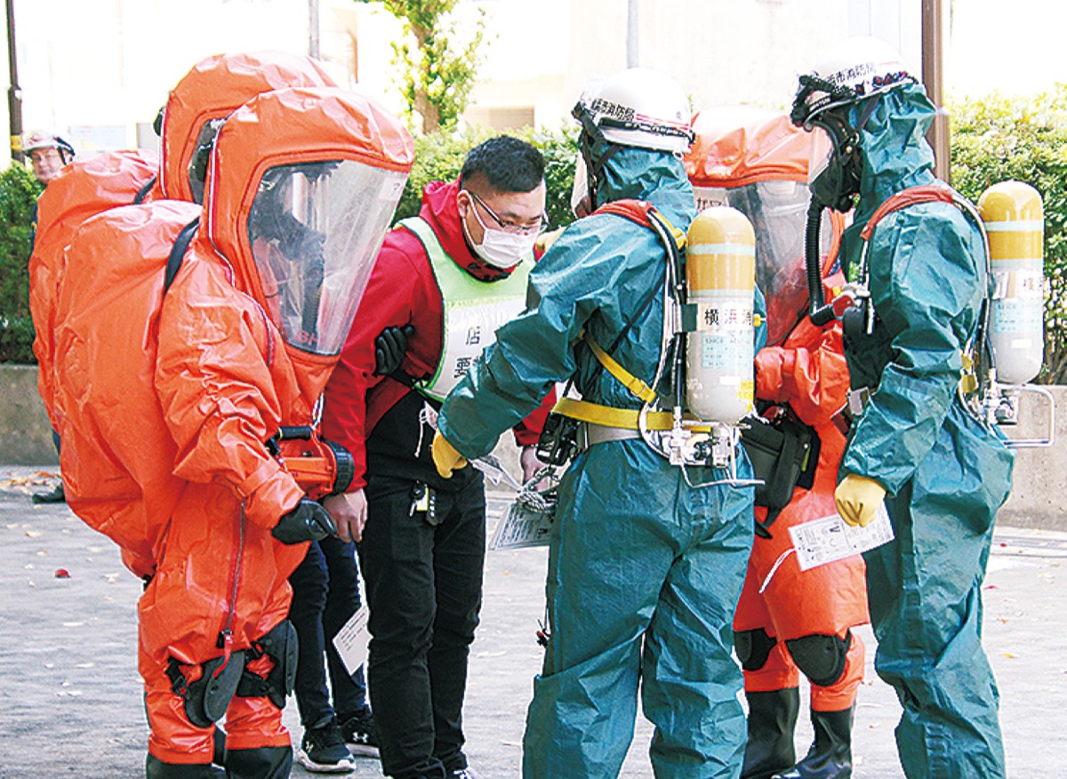 飲食店で何者かが化学物質を散布し、複数の負傷者が発生したという想定で訓練が進められた。消防隊は防護服を装備した上で、飲食店に見立てた公園内の建物から逃げ遅れた人を救助し、水を使って除染したり、人工呼吸を行うなどした。2人の消防団員は日本語、英語、中国語の順で周囲に「危ないので建物から避難してください」とアナウンスを行った。建物から住民役が避難すると、2人は状況を説明し、具合が悪い人がいないかを尋ねるアナウンスを続けた。