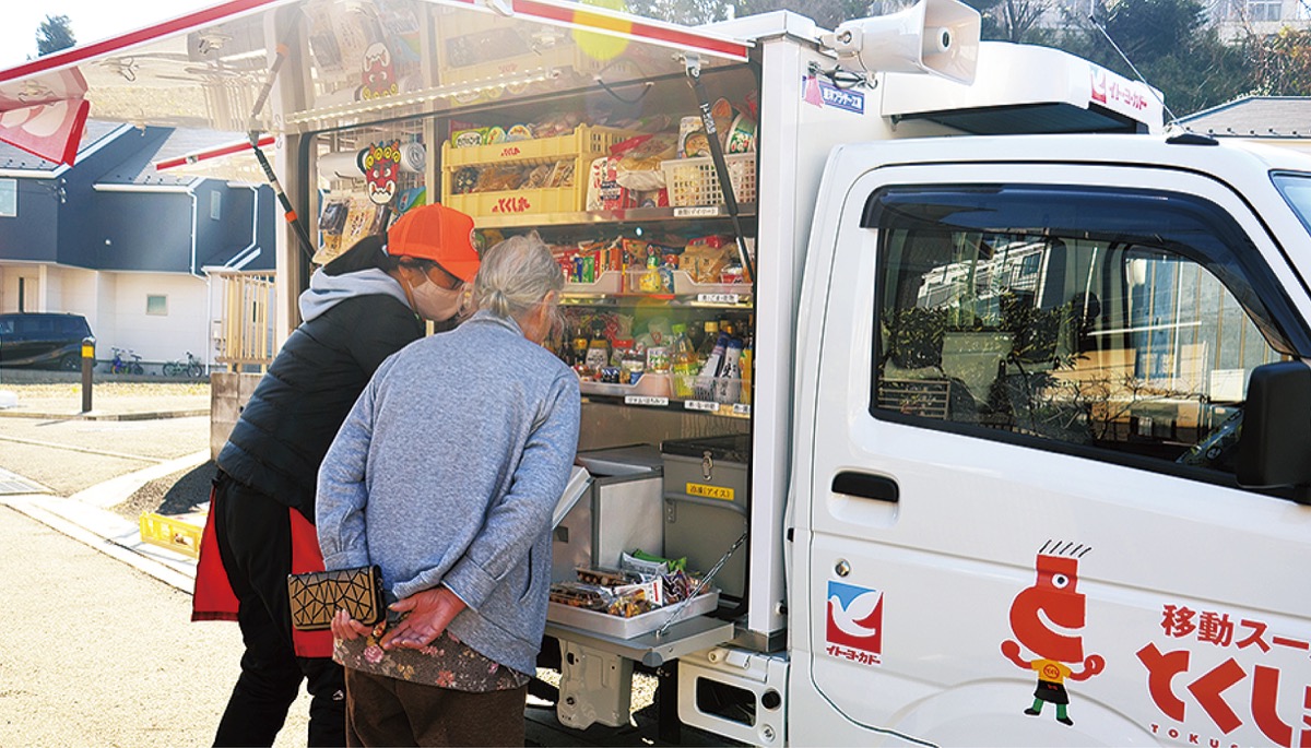とくし丸を初めて利用した70代女性は「ウェブ上で注文を受け付けるネットスーパーも便利だが高齢者には難しいところもある。それに実際に自分の目で商品を選べるのが嬉しい」と話し、スタッフとのコミュニケーションも楽しいという。