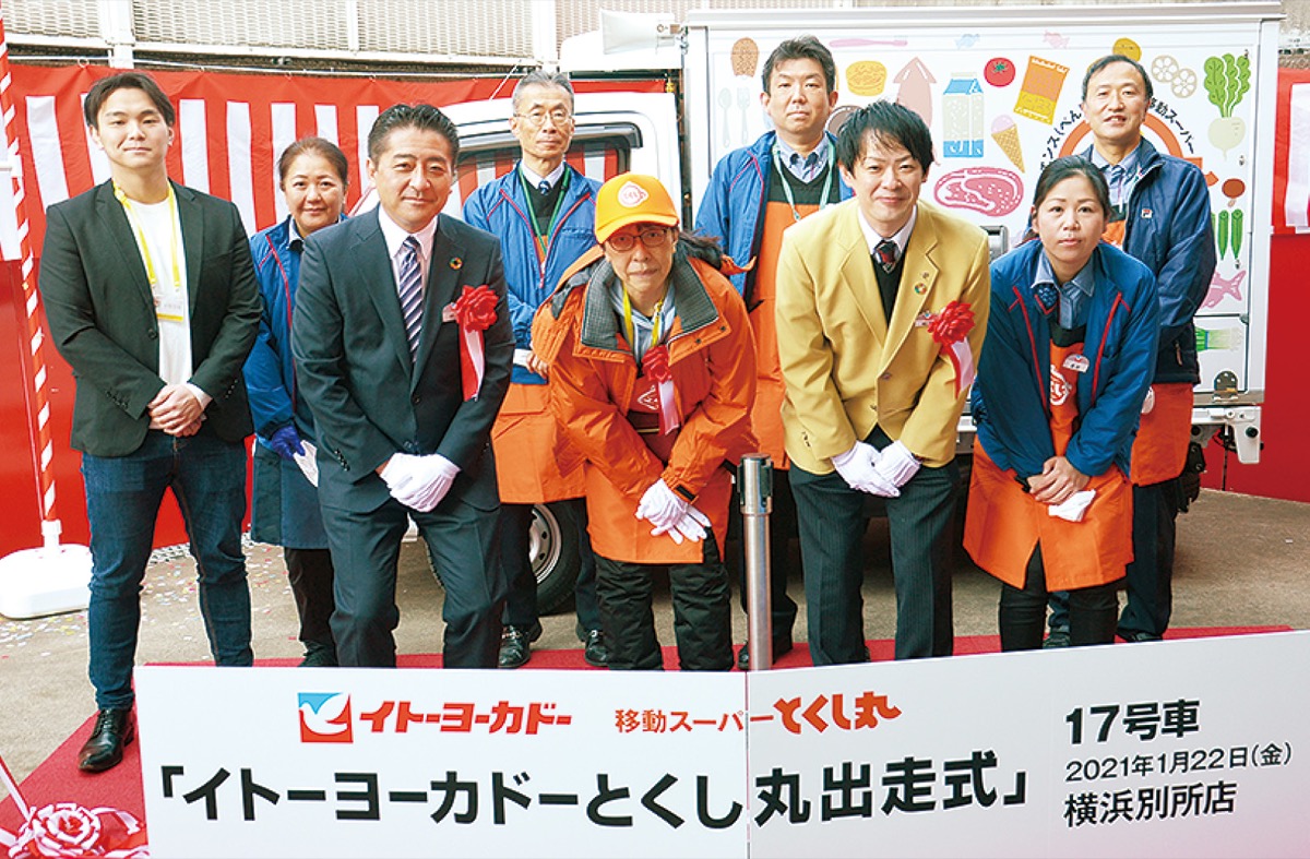 イトーヨーカドー横浜別所店は地域の買物困難者を支援しようと、移動スーパー「とくし丸」と提携し、1月22日から業務をスタートさせた。出走式も開かれ、横浜別所店の松島孝義店長や、とくし丸の社員らが出席して意気込みを語った。