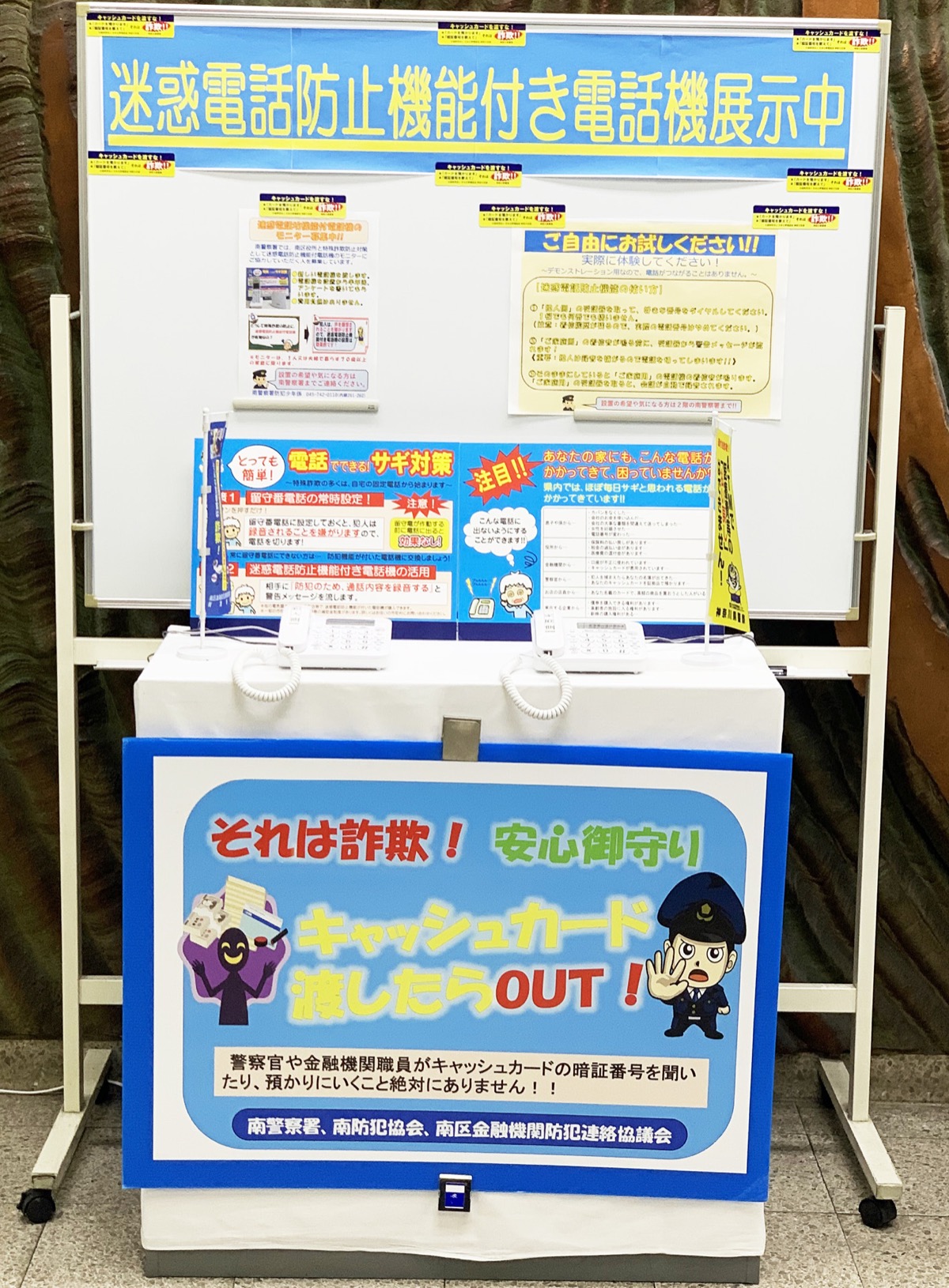 横浜市南区大岡2丁目の南警察署がこのほど、住民を区内で多発する特殊詐欺から守ろうと、「迷惑電話防止機能付き電話」を紹介した特設ブースを1階に設置した。