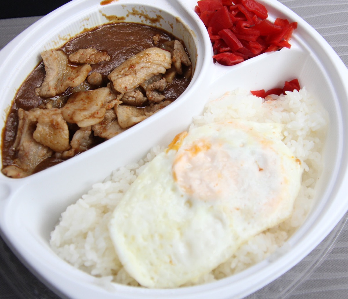 ボリューム満点のカレーが味わえる有名店「バーグ」。吉野町のほか、大通公園沿いの弥生町、戸部や杉田などにも店舗がある。写真は1番人気の「スタミナカレー(ヤキ)」(800円)。豚バラ肉とカレーの組み合わせ。「ヤキ」というのは目玉焼きのこと。注文数分で受け取れる。