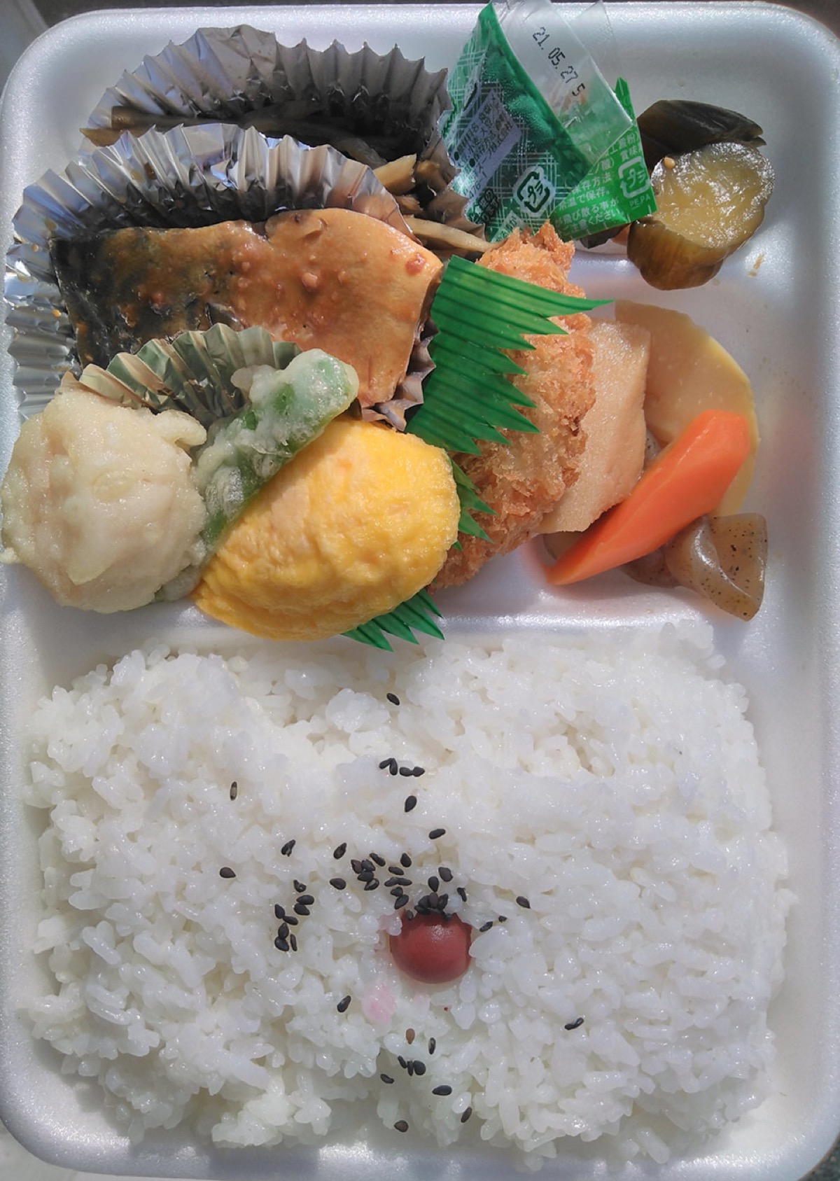 永田北の弁当店。写真は幕の内弁当のライス大盛り(500円+100円)。揚げ物、煮物、魚などバランスが良く見た目も鮮やか。「お待たせしちゃってごめんね」とサービスでくれたヤクルトが嬉しい。