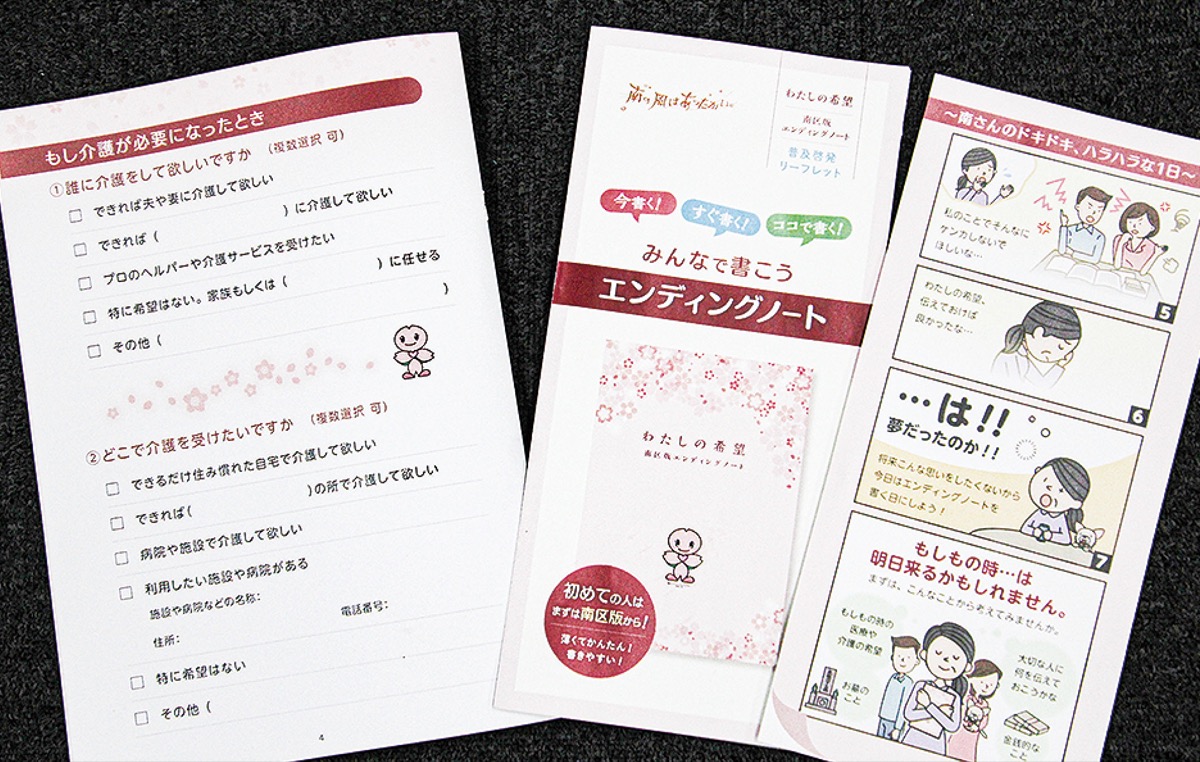 南区役所はこのほど、区が発行している「エンディングノート」の書き方などを説明した普及啓発リーフレットを作成し、地域ケアプラザなどで配布を始めた。