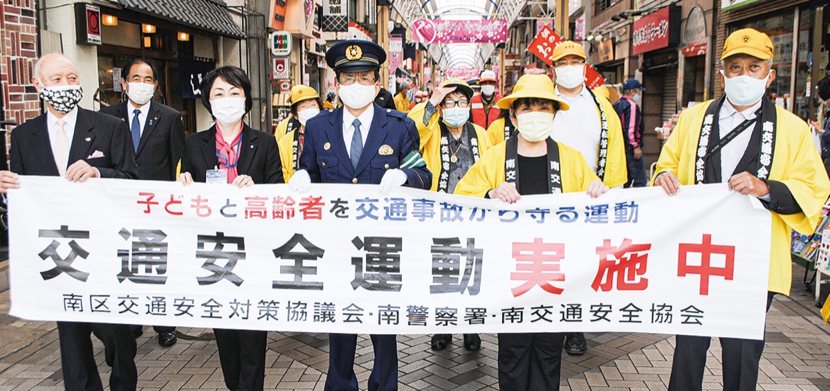 パレードに参加した南区の松山弘子区長は「運転者と歩行者が互いに譲り合うといった思いやりの心を持ち続けていただければ」と話した。南交通安全協会の置田光男会長は「赤信号で横断する歩行者も見られる。『安全は心と時間のゆとりから』を合言葉に各団体と連携強化に励みたい」と語った。