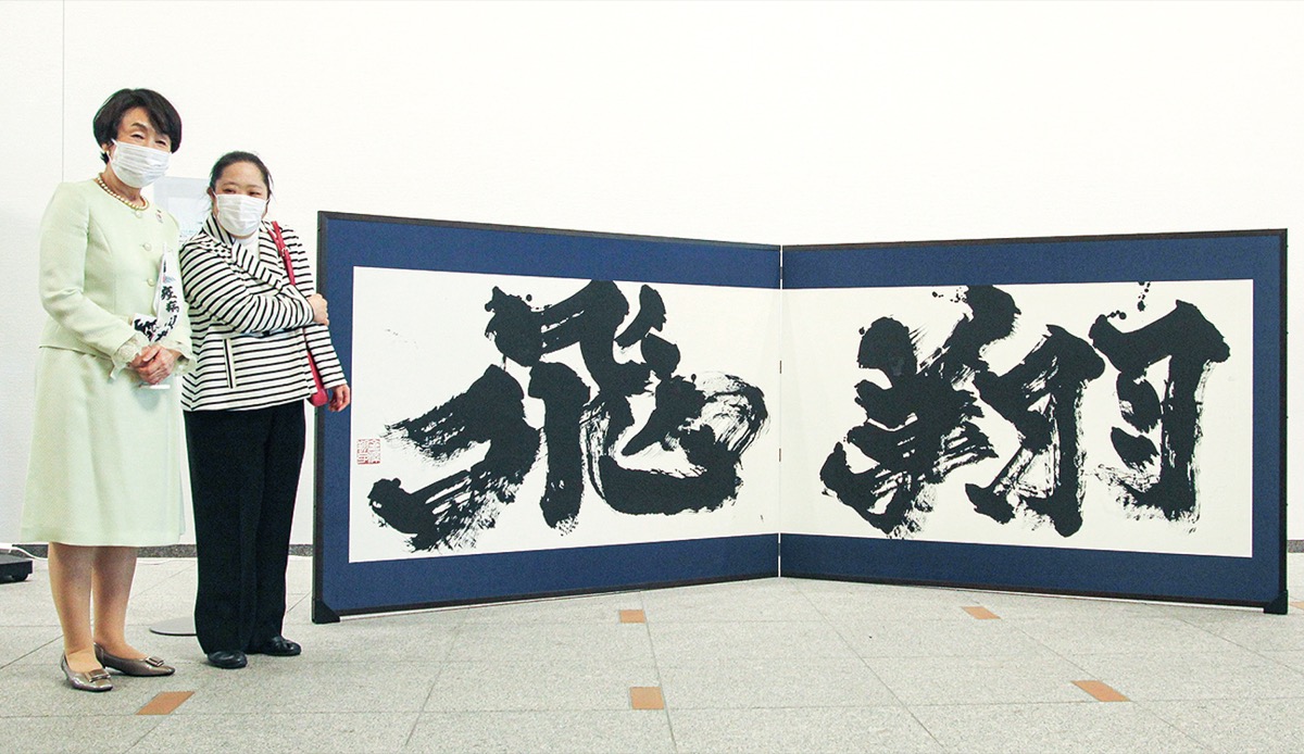 世界的に活動するダウン症の書家、金澤翔子さんが4月23日、横浜市役所を訪れ、東京五輪・パラリンピックへ向けて書いた作品の前で出場する選手へエールを送った。