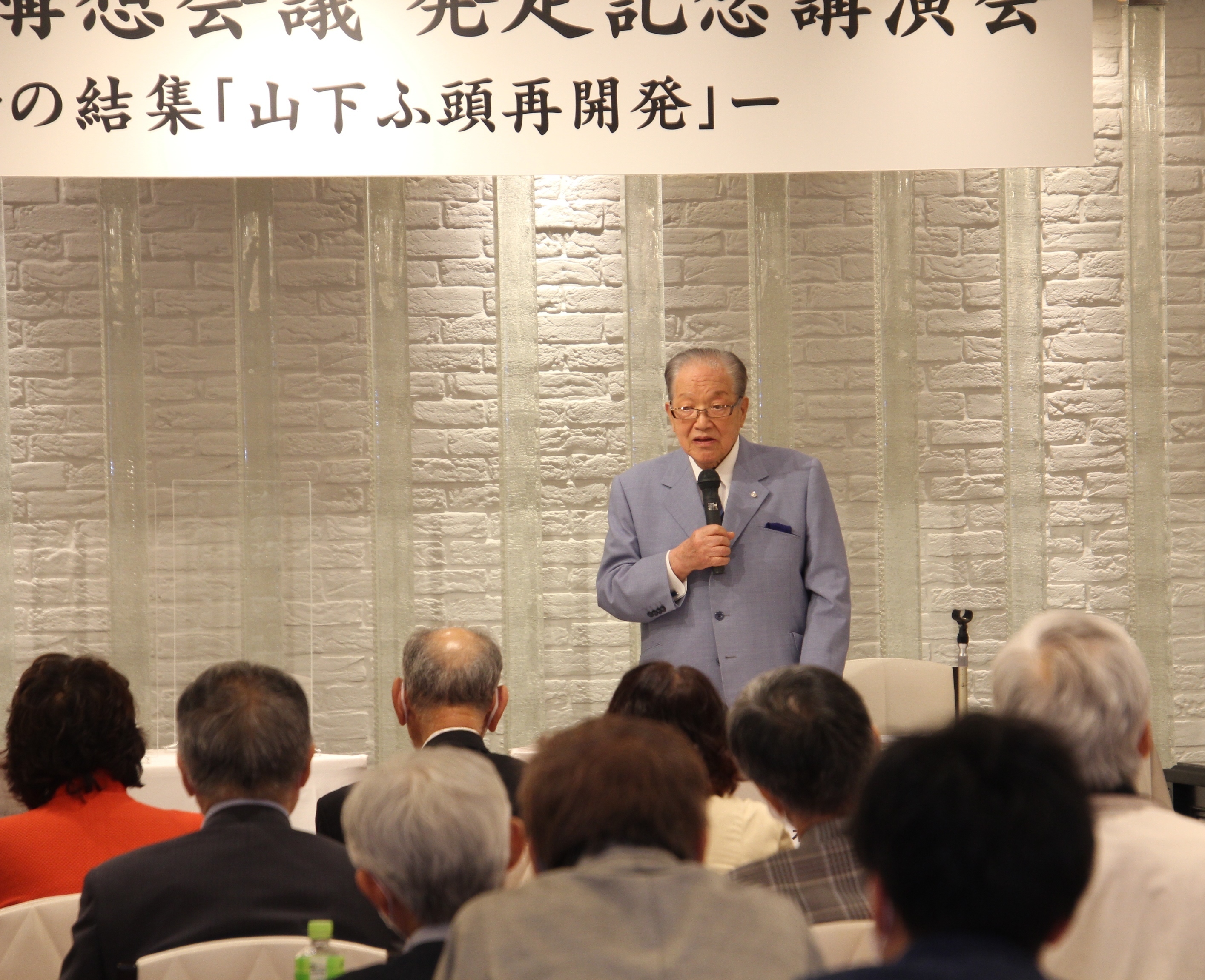 講演会では、同会議の議長に就いた横浜港運協会前会長でIRとは異なる山下ふ頭の再開発を掲げる横浜港ハーバーリゾート協会の藤木幸夫会長=写真=が改めてIR誘致に反対の姿勢を示しました。世界銀行などが行った世界のコンテナ港湾の効率性ランキングで横浜港が1位になったことを挙げた上で「山下ふ頭の将来は日本の将来。命を懸けて守る」と語りました。