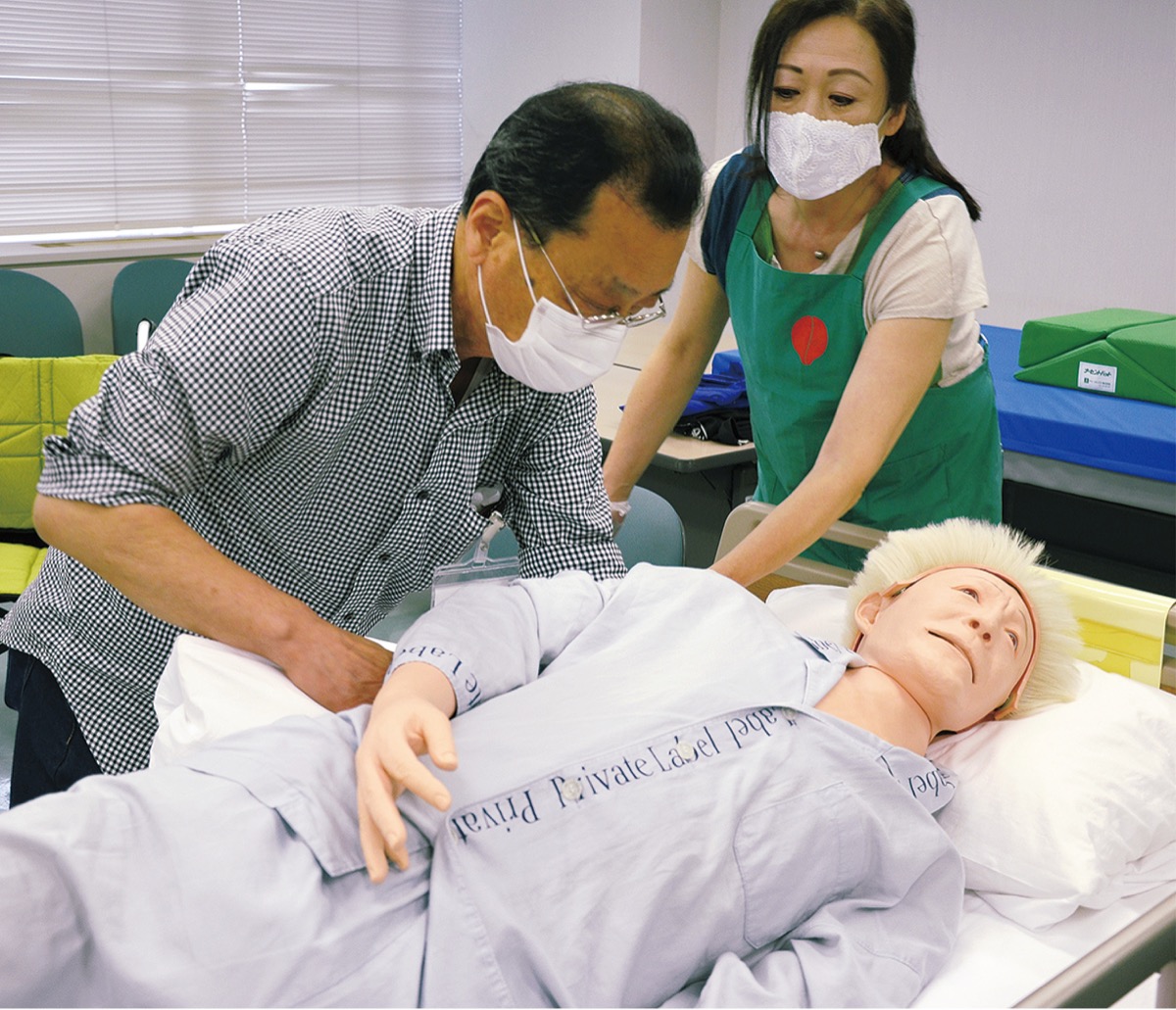 この日は中村町3丁目のJCHO横浜中央病院附属看護専門学校で開催。日本シルバーサポート協会=本部・世田谷区=から講師を招き、約50kgの介護練習人形を使って要介護者の体位交換や衣服の着脱、ベッドから車いすへの移乗介助などの技術を学んだ。