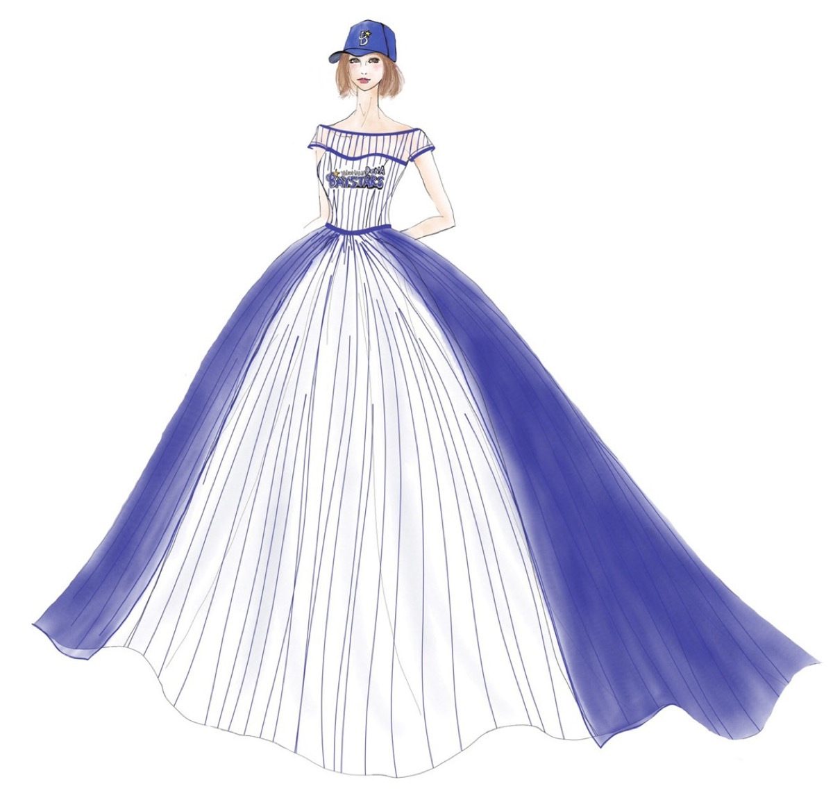 ドレスはベイスターズのユニフォームデザインを基調にしたものなど5パターン。ドレスと対になるタキシードも2種類制作した。