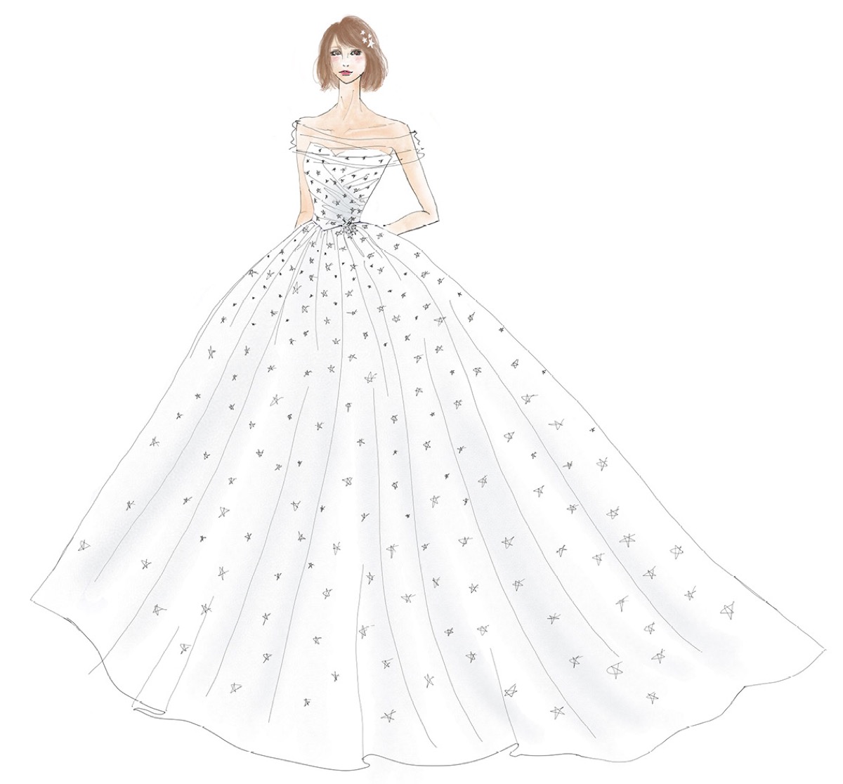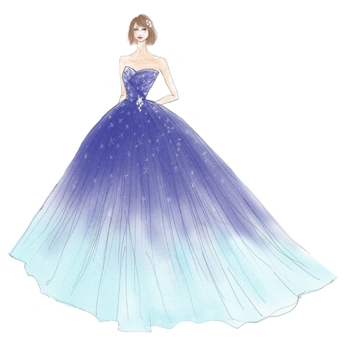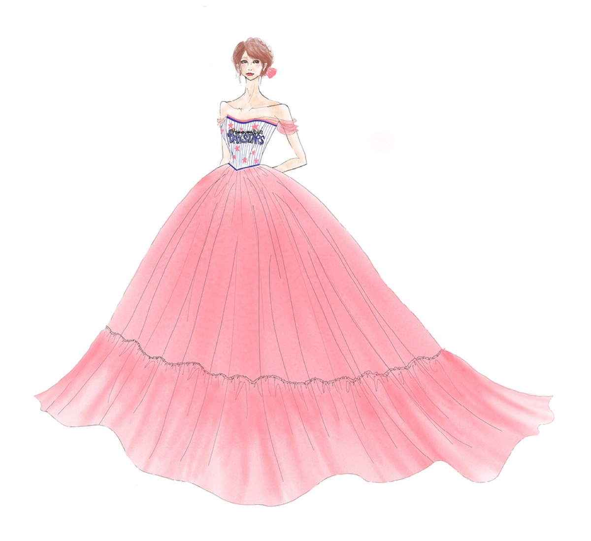 「ユニフォーム」はユニフォームデザイン活かした大きなドレス。ブラウスとオーバースカートの着脱が可能で、1着で2度楽しめる。「Star」は華やかな星柄のグリッターチュールの上にグラデーションチュールのベールをまとった美しいデザイン。「ピンク」はストライプ柄のベアトップを取り外せば、星柄のグリッターが現れるスタイル。「ウェディング」は星柄レースを使用したウェディングドレス。胸元は柔らかいチュールを使用したオフショルダーになっていて、後ろ腰にはリボンが付き、スタイリッシュなデザインとなっている。
