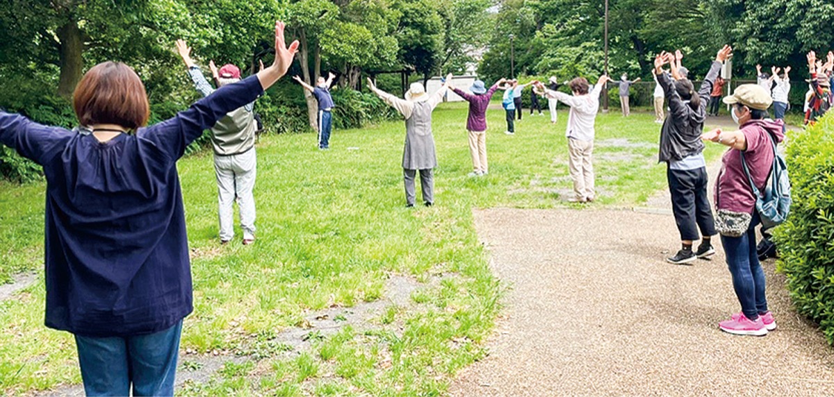住民の健康増進を目的とした「笑いヨガ」が5月24日、六ツ川中央公園で行われた。感染症対策を講じた上で行われ、26人が参加した。