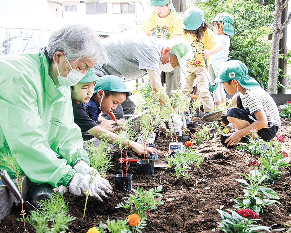 5月26日から、区内13公園の花壇にコスモスを植えている。6月3日は井土ヶ谷下町の鶴巻橋公園で同公園愛護会のメンバー4人と市立井土ケ谷保育園の5歳クラスの園児約20人がコスモスの苗を花壇に植えた。南土木事務所の職員が園児に花の育て方について説明した後、愛護会のメンバーとともに苗を植えた。苗は園児が約2カ月かけて種から育てたものを使用した。