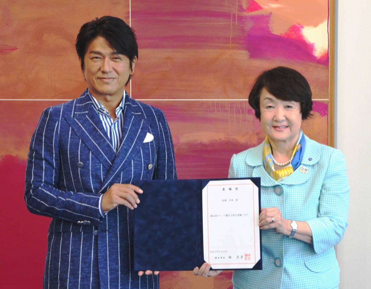 高橋さんは「クルーズ船はさまざま国の人が集う国際交流の場でもある。コロナと向き合いながら、横浜の魅力を皆さんに伝えていきたい」と意気込みを語った。林市長は「芸能界で幅広く活躍する高橋さんの影響力は大きい。クルーズ船はもちろん、横浜のさらなる振興につながる」と期待を込めた。