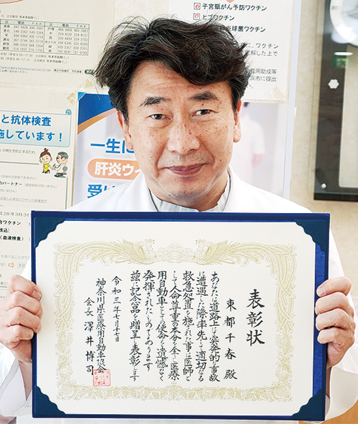 清水ヶ丘のあずま医院の院長、東都(あずま)千春医師が昨年11月に二輪車事故で危篤状態となった男性の救命処置を行い、このほど、県医療用自動車協会(澤井博司会長)から表彰状が贈られた。