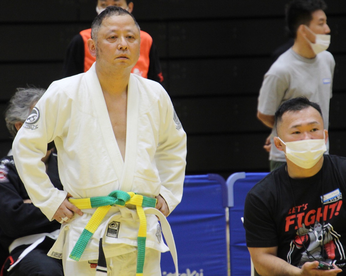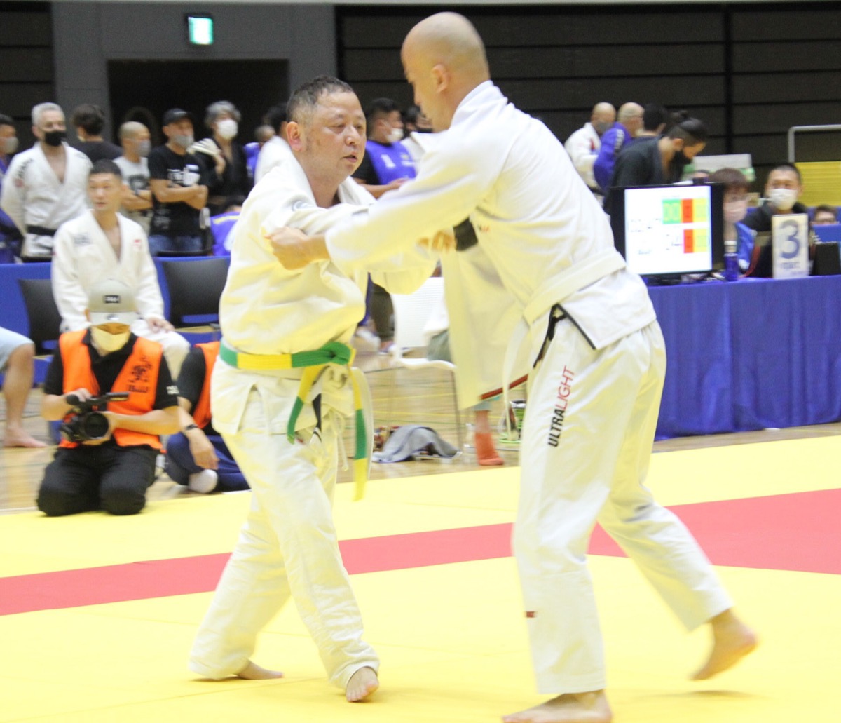 同選手権は30歳以上の選手がクラス、年齢、体重別にトーナメントで競うもの。嶋田さんは1970年以前生まれの「マスター5」の白帯ライト級(76kg以下)に出場。トーナメント戦の1回戦で大柄の選手と対戦。序盤は相手との間合いを取りながら組み手争いが続いた。1分過ぎ、相手に倒され、2ポイントを取れられると、そのまま上に乗られた状態で肩を固められ、絞め技で落とされて一本負けを喫した。