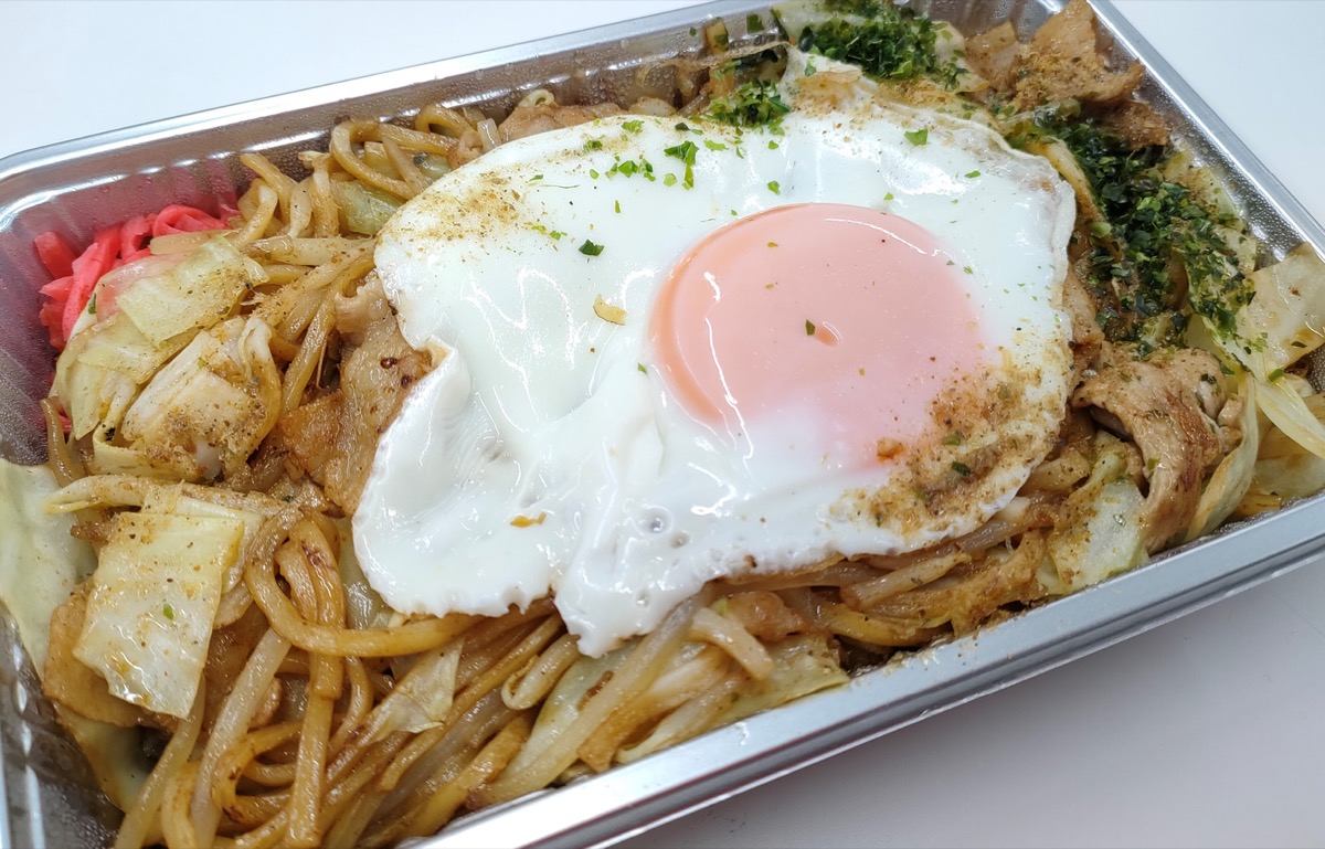黄金町駅そばの細い路地にあるお好み焼き店「粉亭」。今回はおすすめされた「富士宮焼きそば」(750円)を選択。プラス100円で目玉焼きを付けてみた。太めの麺と大きめのキャベツに目玉焼きの黄身を割って混ぜれば、ソースもまろやかに感じる。注文から約5分で仕上げてくれるのも嬉しい。