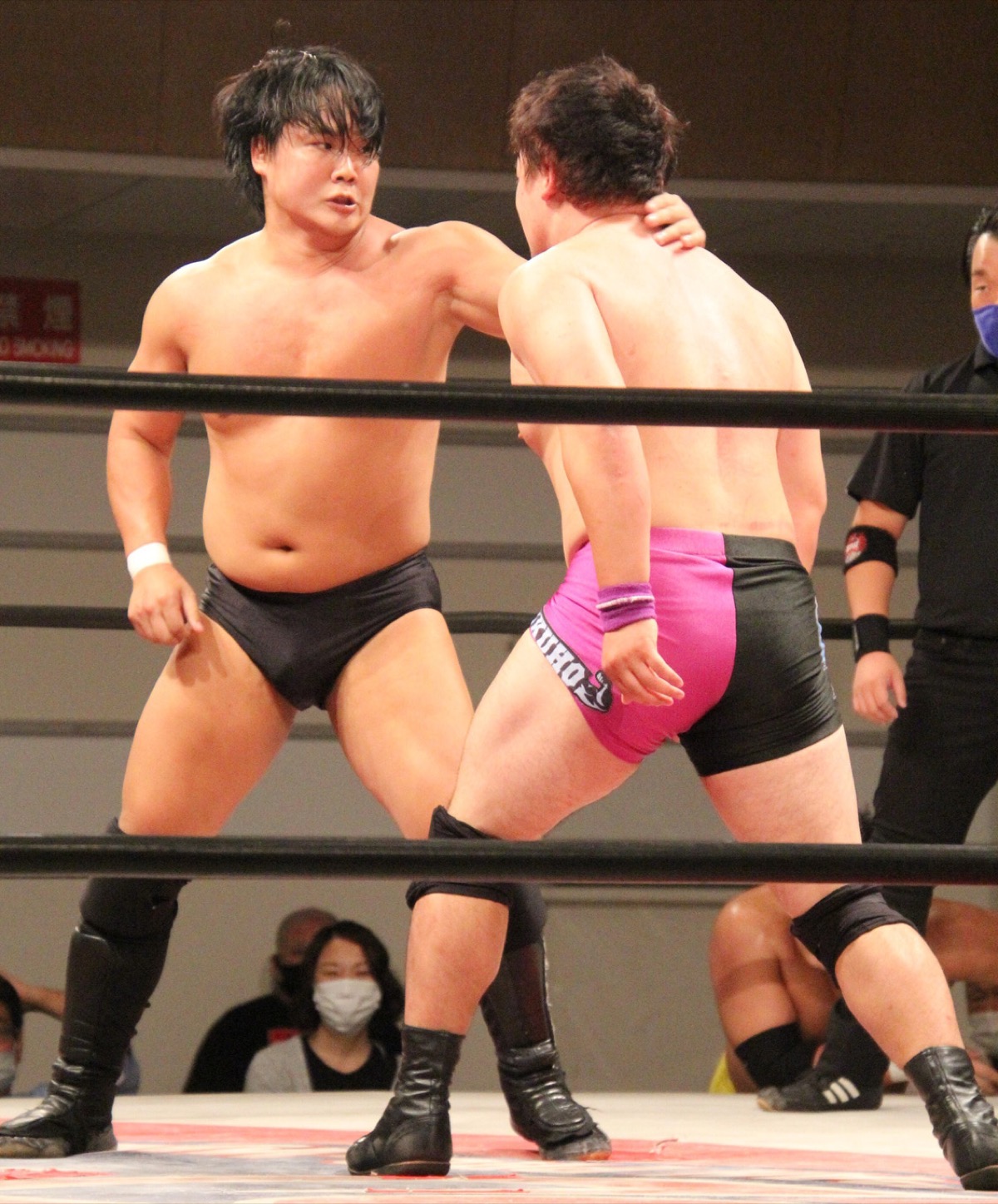 メインイベントの「IRON FISTタッグ選手権試合」には、BJW認定世界ストロングヘビー級王座の野村卓矢選手と阿部史典選手組が加藤拓歩選手・鈴木敬喜選手組を迎え撃ち、最後は野村選手が加藤選手から腕ひしぎ十字固めでギブアップを奪い、2度目の防衛に成功した。