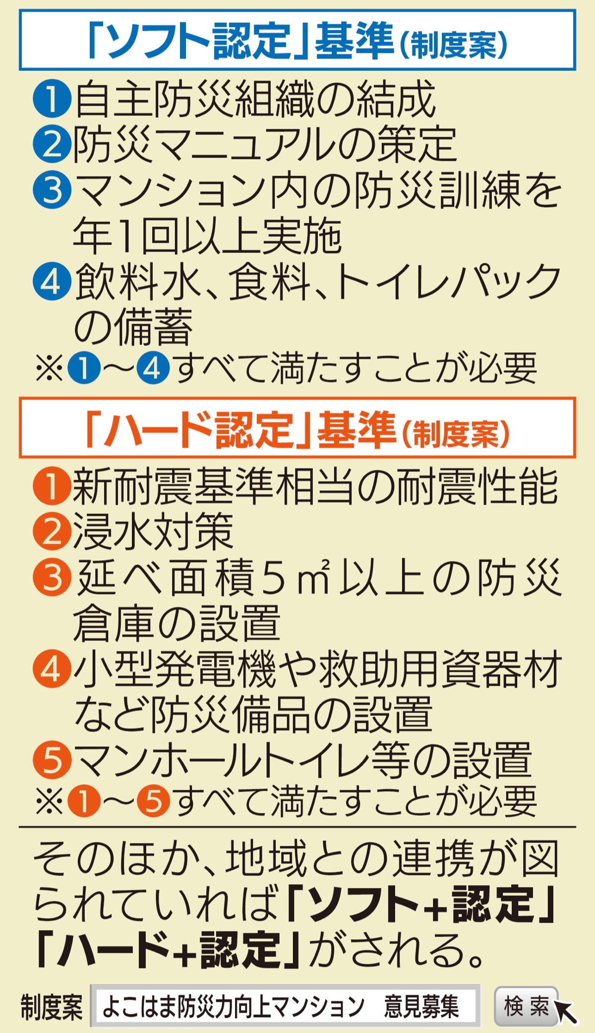 横浜市でも一部を除いて補助金はなく、「防災力向上」の意図をどれだけ周知できるかが認定数増加のカギを握る。昨年1年間に建設された新築マンションは約1千棟、既存マンションは約8万4千棟になる横浜市で、申請者が検討しやすい制度になるかどうかもポイントとみられる。