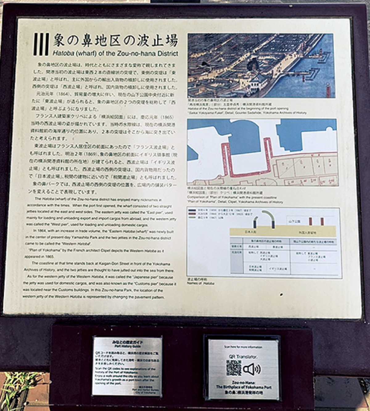 桜木町駅前などの7カ所に設置された12種類の「みなとの歴史ガイド」の二次元コードをスマートフォンで読み取ると、横浜港周辺の歴史が音声と文章で解説される。