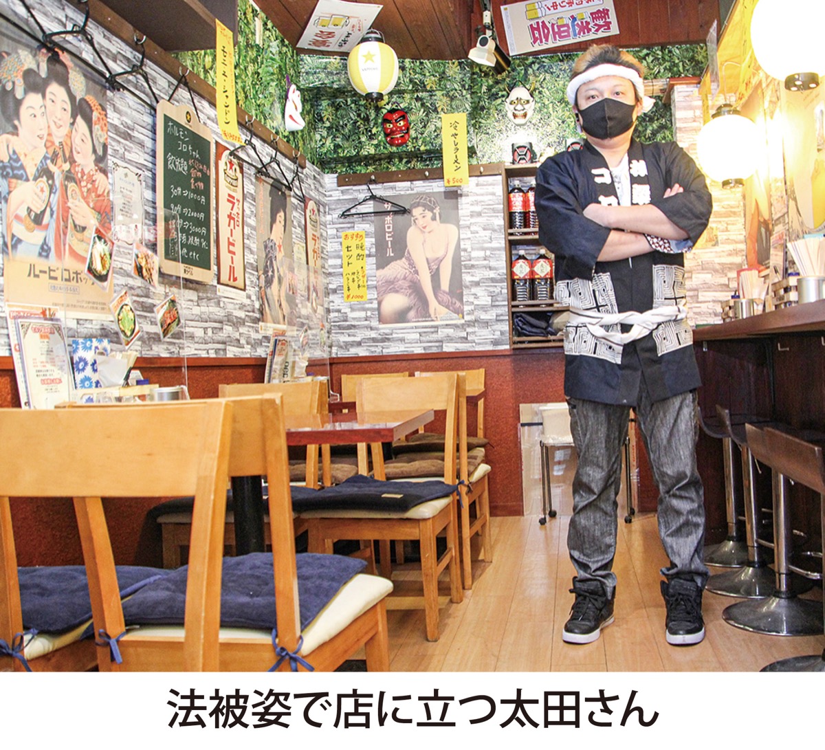 緊急事態宣言の解除を受け、10月にスタートを切った。ワインバーの常連客も店に顔を見せるが、大半は新規客。太田さんは店の「棟梁」としてねじりはきまきに法被姿で盛り上げる。「下町とレトロな雰囲気を出したい」と店内のビールポスターからは昭和の香りが漂う。