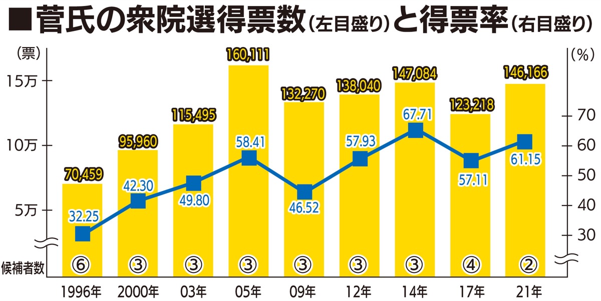 今回の菅氏の得票率は61・15%で2014年に次いで2番目の高さ。当選した過去8回、2区は3人以上が立候補していたが、今回は一騎打ち。野党統一候補との争いの中で6割以上を獲得したことに、自民市議は「厳しいと言われた中でこれだけ取れれば上々」と安堵の表情を見せた。