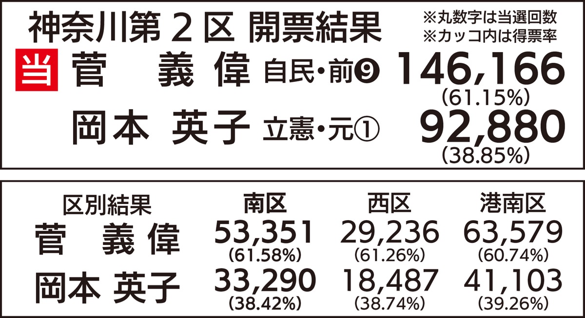 衆議院議員選挙の投開票が10月31日に行われた。自民党、公明党の与党が過半数を維持する中、前職と元職の2人が争った神奈川2区(西区、南区、港南区)は、自民党の前職・菅義偉氏(72)が約14万6千票を獲得し、立憲民主党の元職・岡本英子氏(57)に約5万票の大差で9回目の当選を決めた。南区の投票率は53・13%だった。
