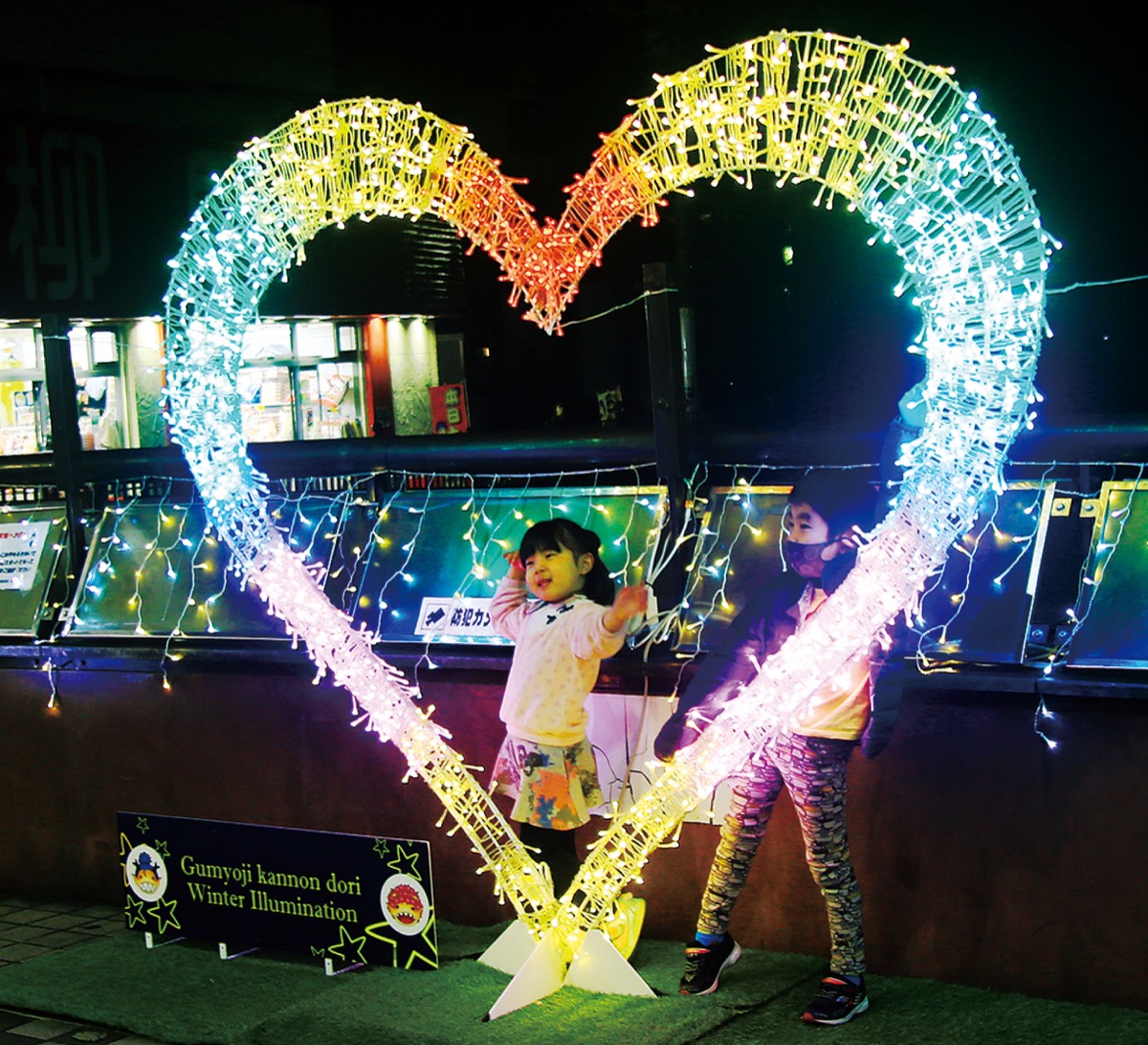 イルミネーションは高さ約2mのハート形。ピンクや赤、シャンパンゴールドなど5色のLED電球が輝く仕組み。そばには商店街のキャラクター「オグジ」「サグジ」が描かれた看板もあり、商店街側は「撮影をして、SNSで弘明寺を広めてほしい」という。点灯は午後4時から11時まで。