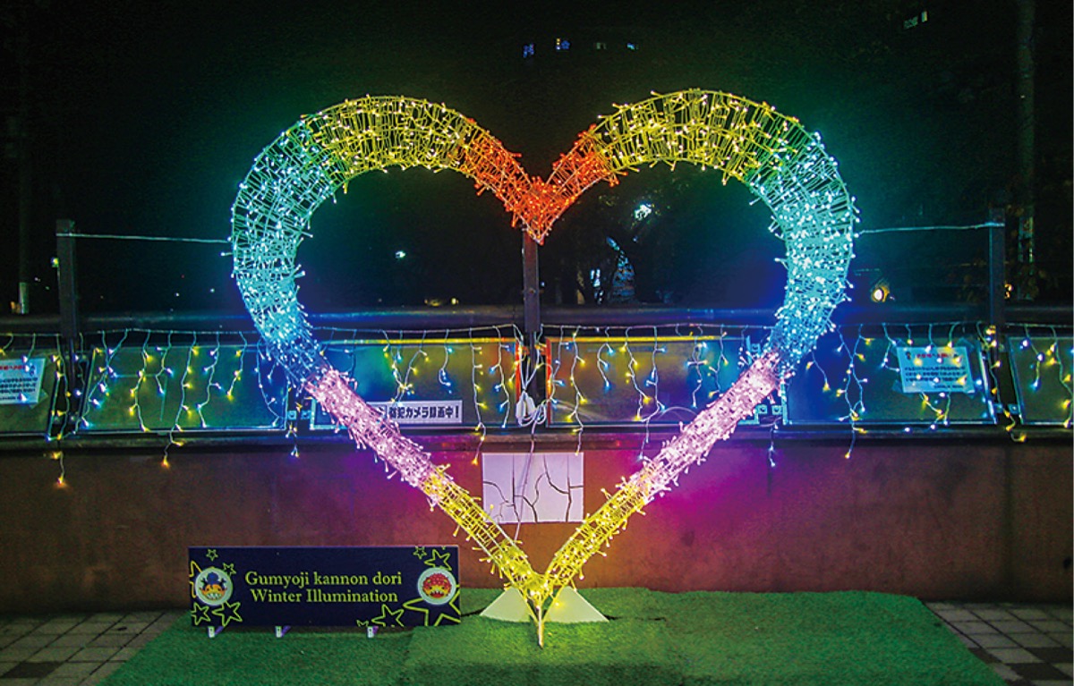 11月下旬からは「弘明寺観音通りイルミネーション2021」がスタート。さくら橋の上にハートの形をしたイルミネーションフォトスポットが設置されている。橋上はきらびやかに装飾され、写真撮影に最適。