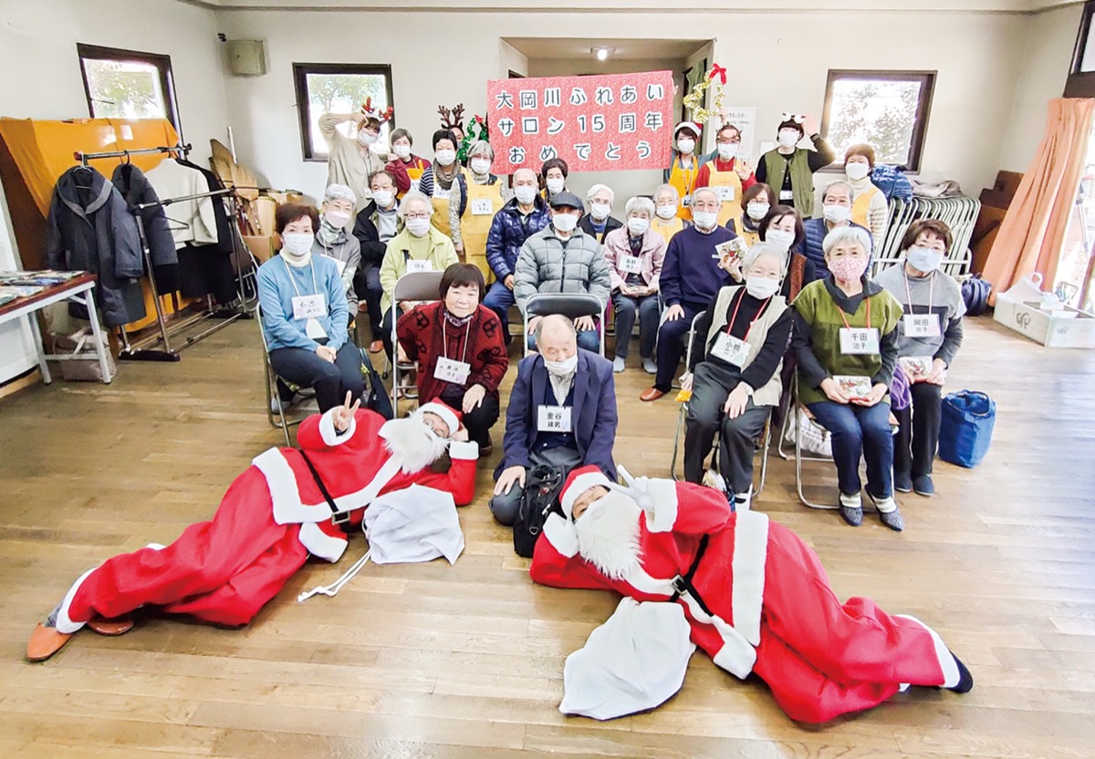 コロナ禍で昨年春から活動を休止していたが、今年9月に再開。今年最後の開催となる10日は約30人が集まり、15周年を祝った。同地域ケアプラザや南区社会福祉協議会の職員がサンタクロースに扮し、会場を盛り上げた。参加した80代の男性は「ここに来てみんなと会うと自分も元気になれる」という。