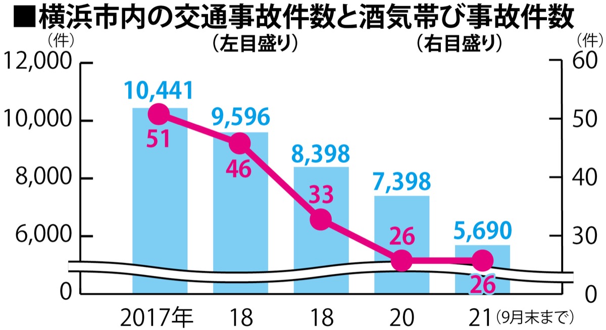 横浜市交通安全対策協議会によると、2020年の市内の交通事故件数は7398件。そのうち、酒気帯びによる事故は26件だった。17年に比べて全事故件数は約3割減、酒気帯び事故は半減している。しかし、今年は9月末までの事故件数は5690件でこのままのペースだと20年を上回る。酒気帯び事故はすでに26件に達している。