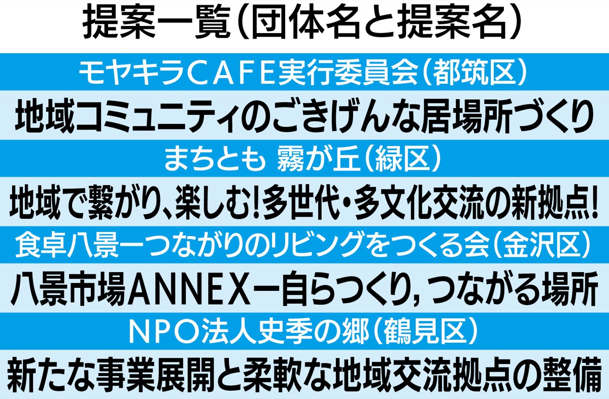 最終審査に臨む提案は▽地域住民が気軽に立ち寄れるコミュニティカフェ▽団地の空テナントを活用した多世代・多文化交流拠点▽空き家を改修したシェアハウスの共用部を地域に開放した多世代交流拠点▽地域の歴史を活用した住民主体の交流活動をサポートする拠点--の4つ。1次を通過した南区の団体は提案を辞退している。