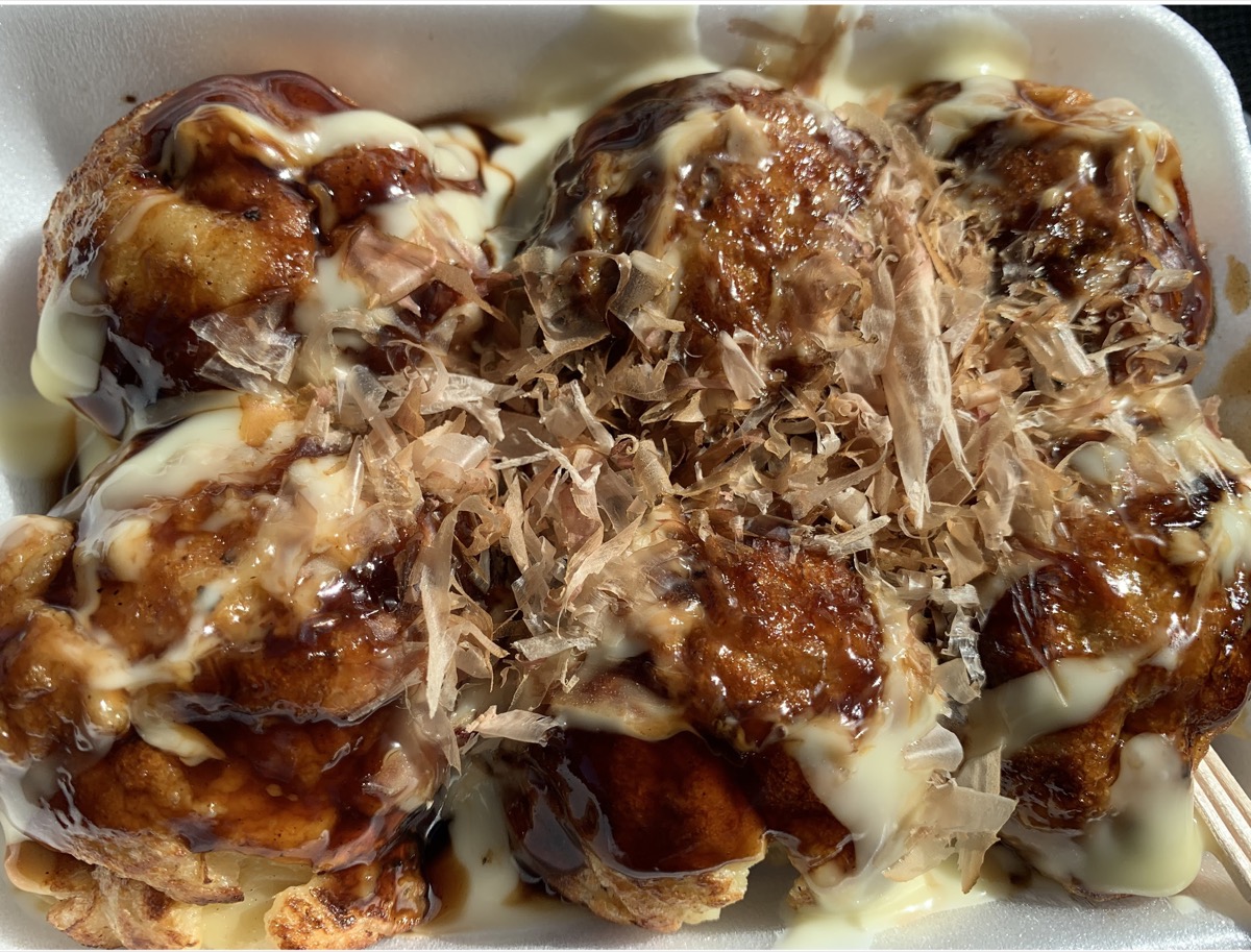 平戸桜木道路沿い、そうてつローゼン六ツ川店の向いにあるお好み焼きとたこ焼きの専門店。看板メニューの一つ、たこ焼きを注文しました。ふわふわの生地に歯ごたえのあるタコが入って、ボリューム満点。焼きそばなども販売しています。