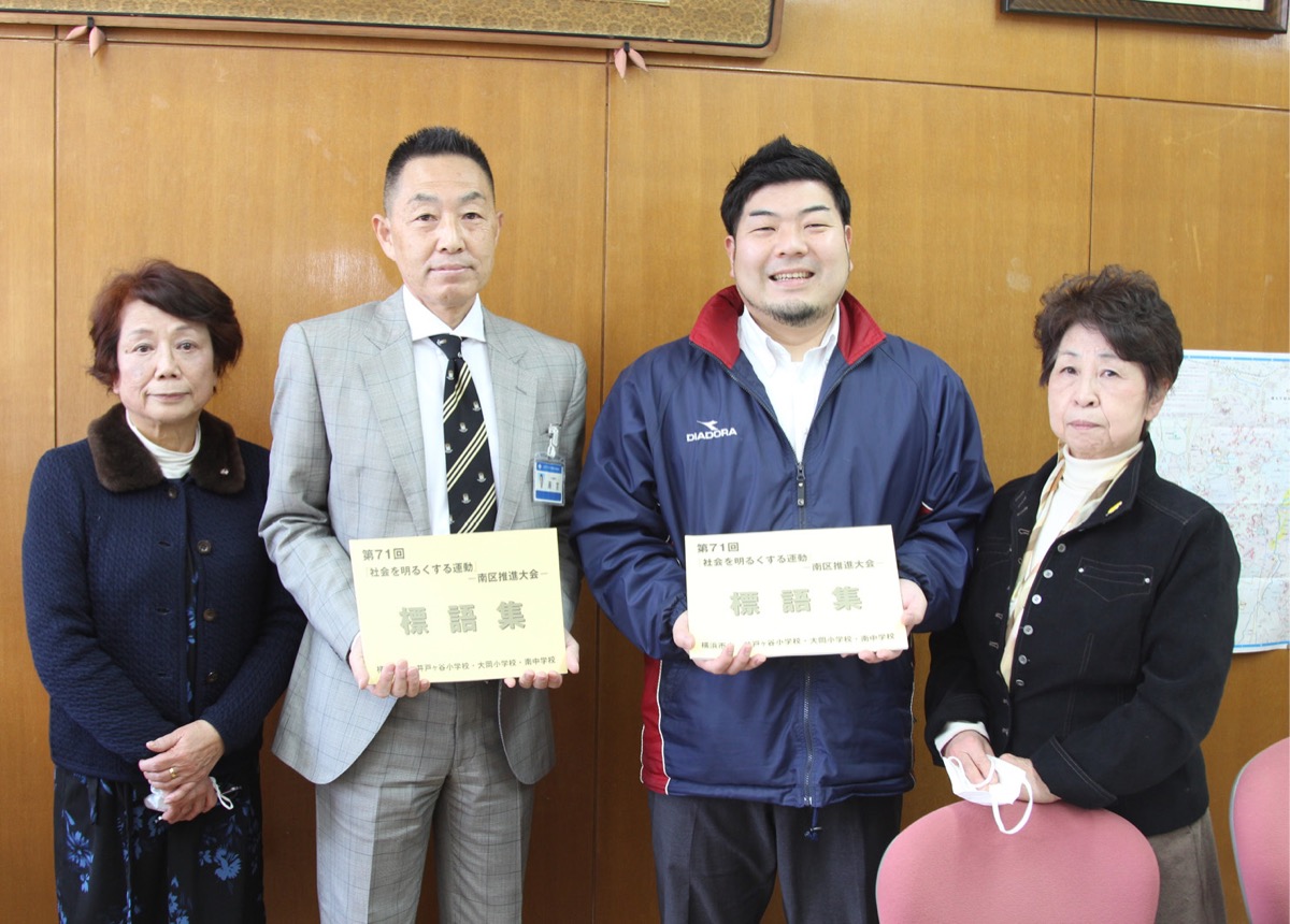 冊子を受け取った南中の藤宮学校長は「コロナ禍で学習を予定通り進めるのが難しい中、ほかの活動と合わせる中で標語作成に取り組んだ」と話した。同校は防災の観点から生徒が地域住民とともに学校周辺の道を点検するなどしており、これを知った保護司会の工藤会長は「こうした活動が社会を明るくすることにつながる」と話した。