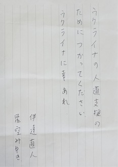 同日昼、区役所に現金が入った手紙が届き、中には「ウクライナの人道支援のためにつかってください ウクライナに幸あれ」と書かれ、差出人には「伊達直人 星空みゆき」とあった。「星空みゆき」はアニメ「スマイルプリキュア!」の登場人物。