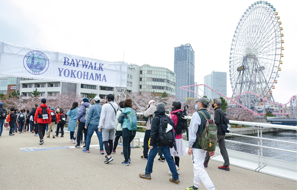 一般社団法人横浜港振興協会主催のウォーキングイベントが3月26日、女神橋=西区=から大さん橋=中区=にかけて行われた。約200人の参加者は潮風を感じながら、海岸沿いのウォーキング&ジョギングコース「BAYWALK YOKOHAMA」を歩いた。