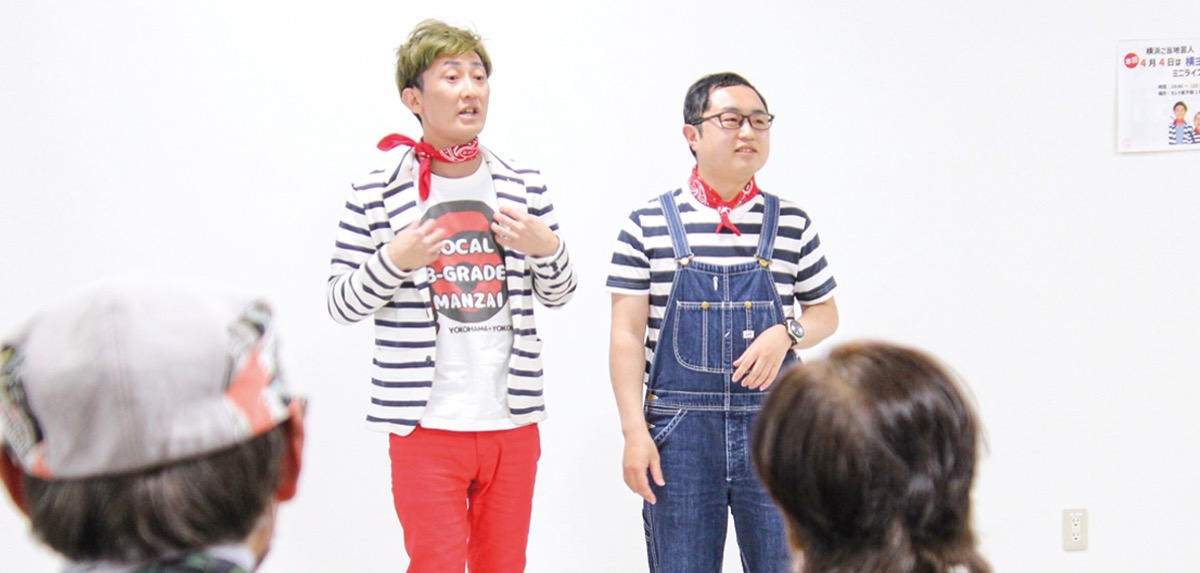 2人が得意にしている横浜の地名を盛り込んだネタなどを披露。上仲誠彦さんは「お客さんの反応が生で感じられるのは嬉しい」と話し、新村晋さんは室内での開催に「声がよく響き、事務所のネタ見せを思い出した」と笑いを誘った上で「雨の中、多くの方に来ていただき楽しい一日になった」と話した。