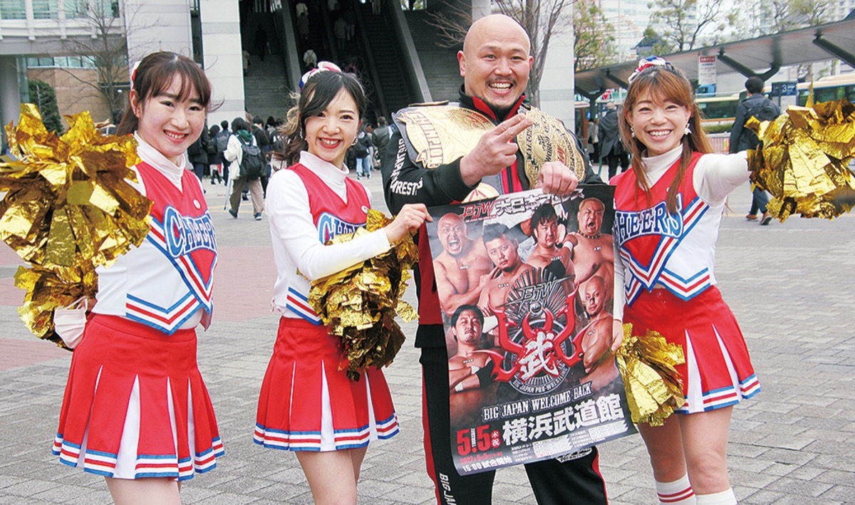5月5日に横浜武道館で大会を開くプロレス団体「大日本プロレス」の岡林裕二選手がこのほど、毎週金曜日の朝に桜木町駅前広場を行き交う人々を「勝手に応援」している「全日本女子チア部☆AJO」のチアメンバーからエールが贈られた。