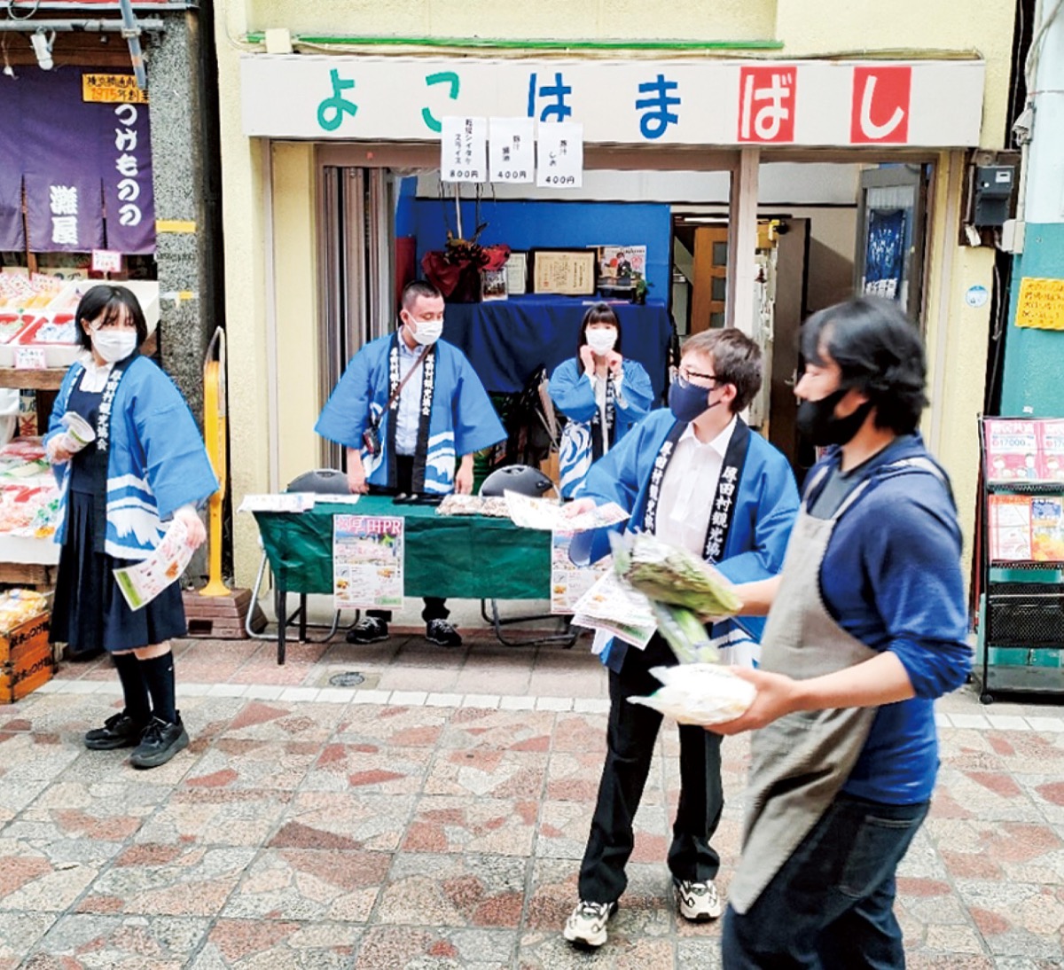 横浜橋通商店街(高橋一成理事長)を5月11日、北海道石狩市の市立厚田学園の中学3年生2人が修学旅行で訪れ、石狩市や厚田の産品などを販売した。