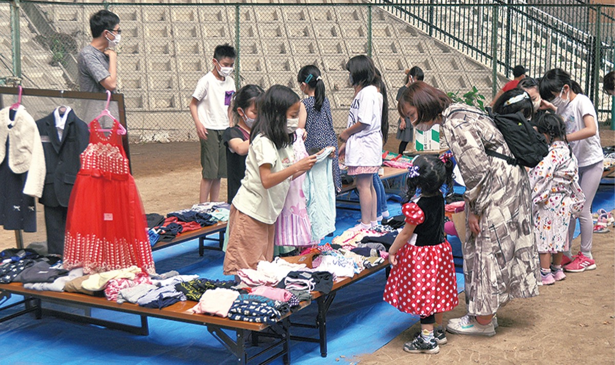 6月18日は洋服や靴、水着、リュックサックなど約300点が並んだ。子どもたちは話し合いを重ね、欲しい物を手に取った。企画に携わった保護者は「子どもたちにコミュニケーション能力や思いやりの心を養ってもらい、コロナ禍で希薄化した保護者の交流を深める機会になった」と手応えを感じていた。