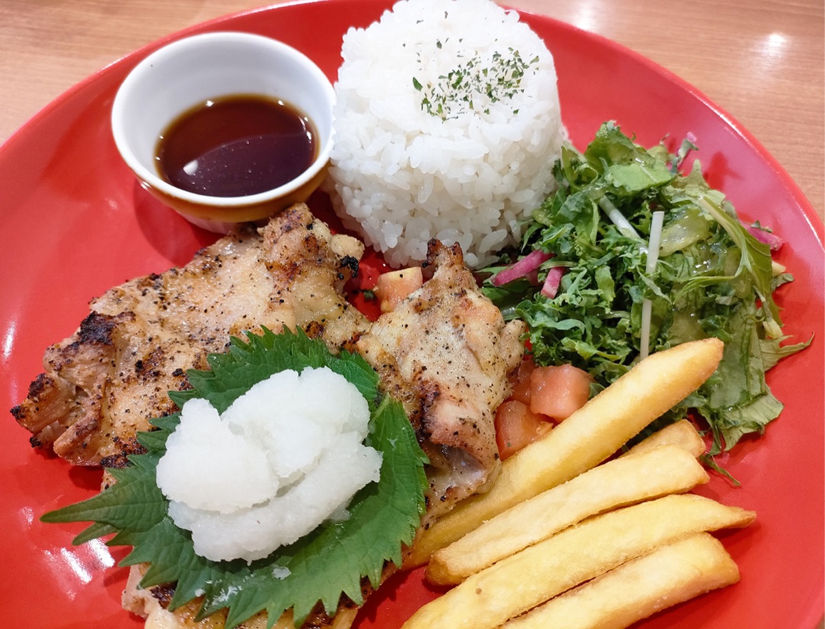 ステーキを中心としたファミリーレストランです。「野菜も食べたい」という方にはサラダバーもあります。そのサラダバーとスープバーが付いたワンプレートメニューがあり、写真の「しそおろし直火焼グリルチキンプレート」(968円)は大きめのチキンをしそ、大根おろしとともにあっさり食べられます。サラダバーには豆腐や枝豆もあり、肉と野菜、豆類をバランス良く味わえます。かながわPayの支払いで10%分のポイントが還元されます。
