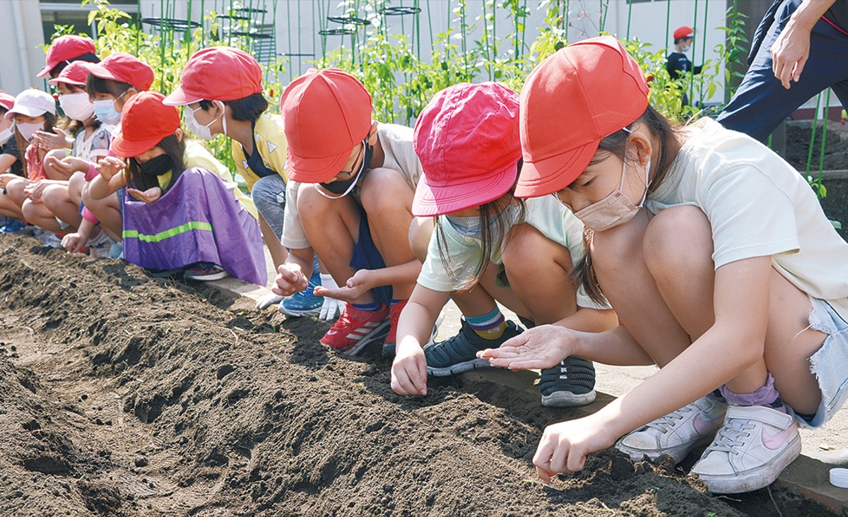 区社協の紹介で、5月に永田小と永田台小に培養土や支柱などの園芸資材を寄付。2年生約160人が生活科の授業で、同社が開発した世界初の種なしピーマン「タネーラ」などの野菜苗を社員とともに畑に植えて、7月に収穫した。