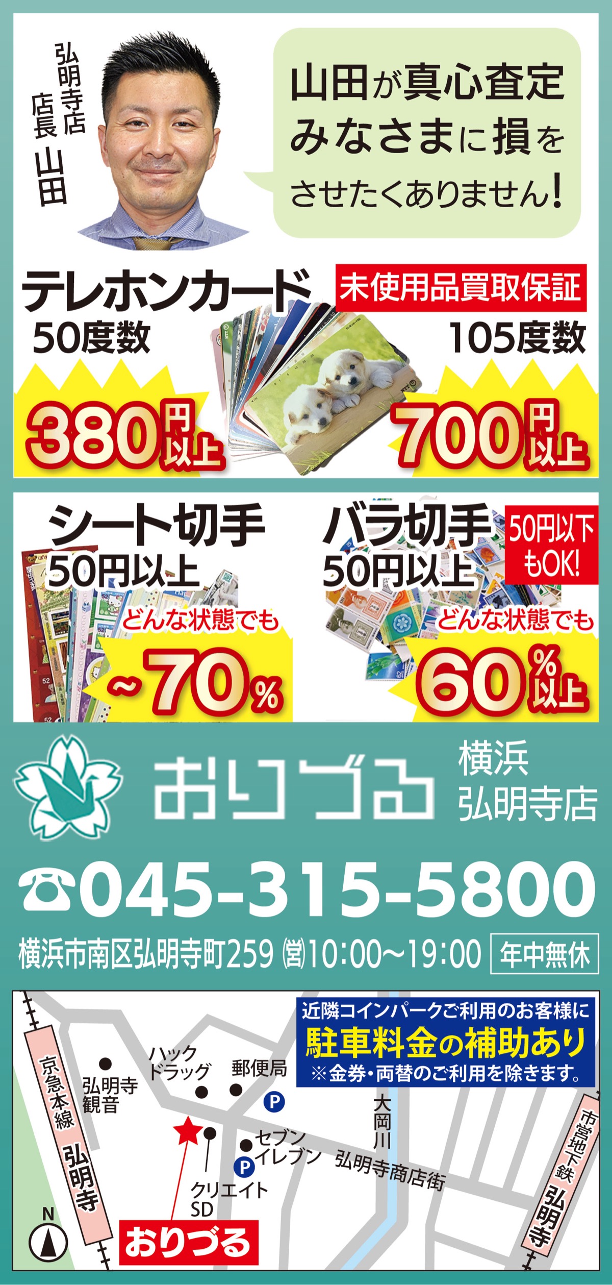 50円以上シート切手は最大70%、テレカ50度数は380円以上で買取保証。そのほか、貴金属やブランド品なども幅広く受け付けている。買取実績豊富な山田店長は「他店で断られた物もお持ちください。長年の経験と独自の販売ルートにより、他社に負けない査定金額がだせます」と自信をもって話す。査定は無料。駅近なので、気軽に足を運んでみては。
