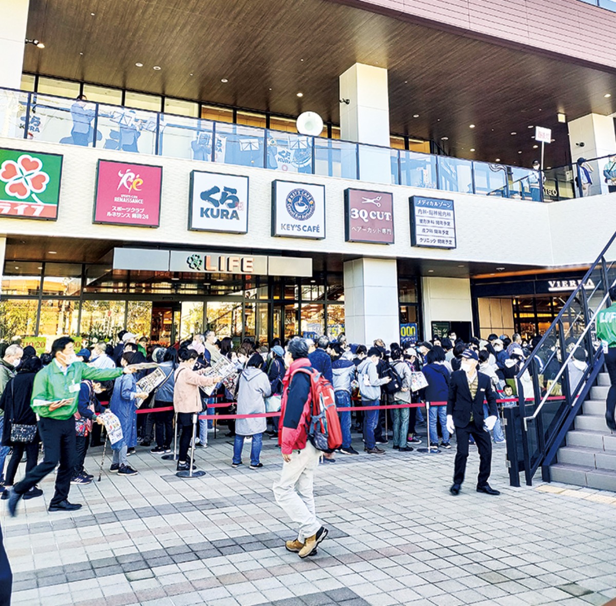 20日、ライフの開店前には店頭に約300人が並び、開店予定の午前9時30分から15分前倒しでオープン。買物客の女性は「良い魚が揃っていた」と話し、別の男性客は「店内で焼かれたパンがおいしそうだったので買ってみた」と感想を語った。