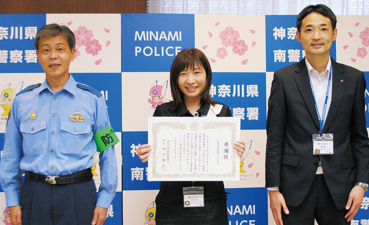 川崎信用金庫六ッ川支店の職員・竹内真依さんが高齢女性を狙った特殊詐欺を未然に防いだとして、10月17日、南警察署(田上数仁署長)から感謝状を受け取った。